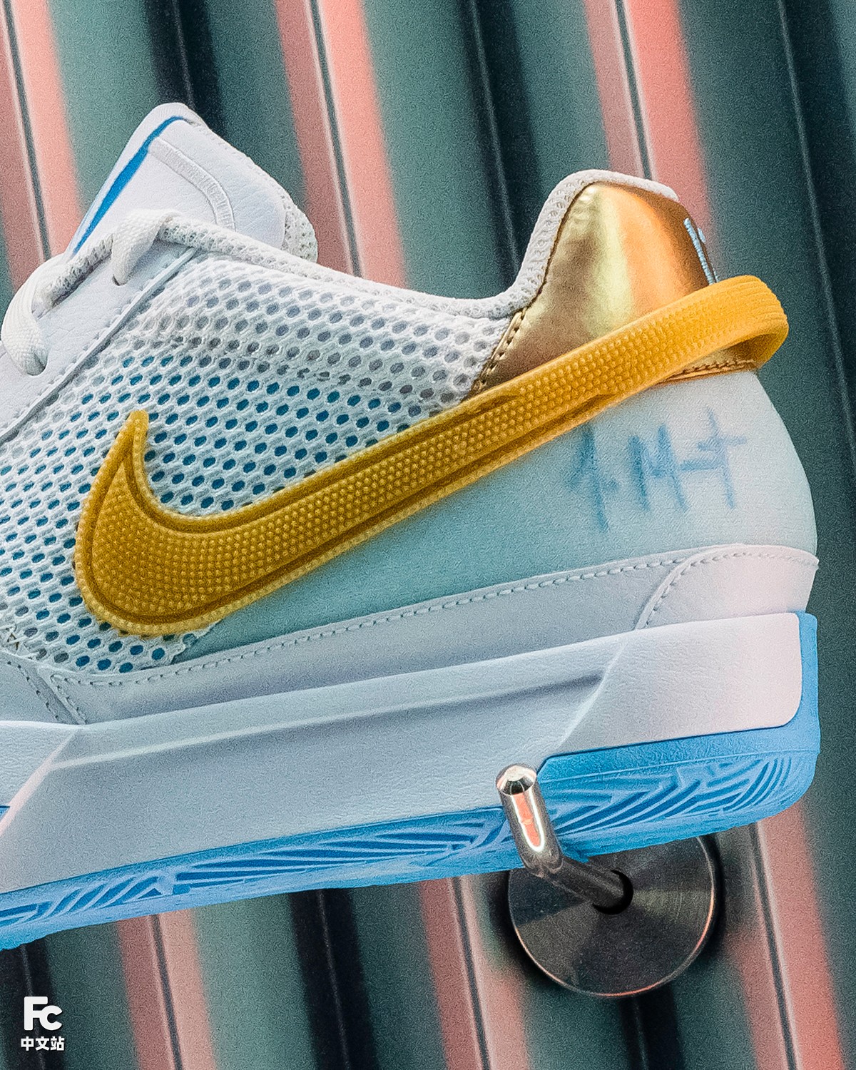 鞋带扣采用龙形结合莫兰特护目镜庆祝动作,Swoosh 则改以金黄色波点诠释,后跟金色映衬 12 球衣号码呼应。