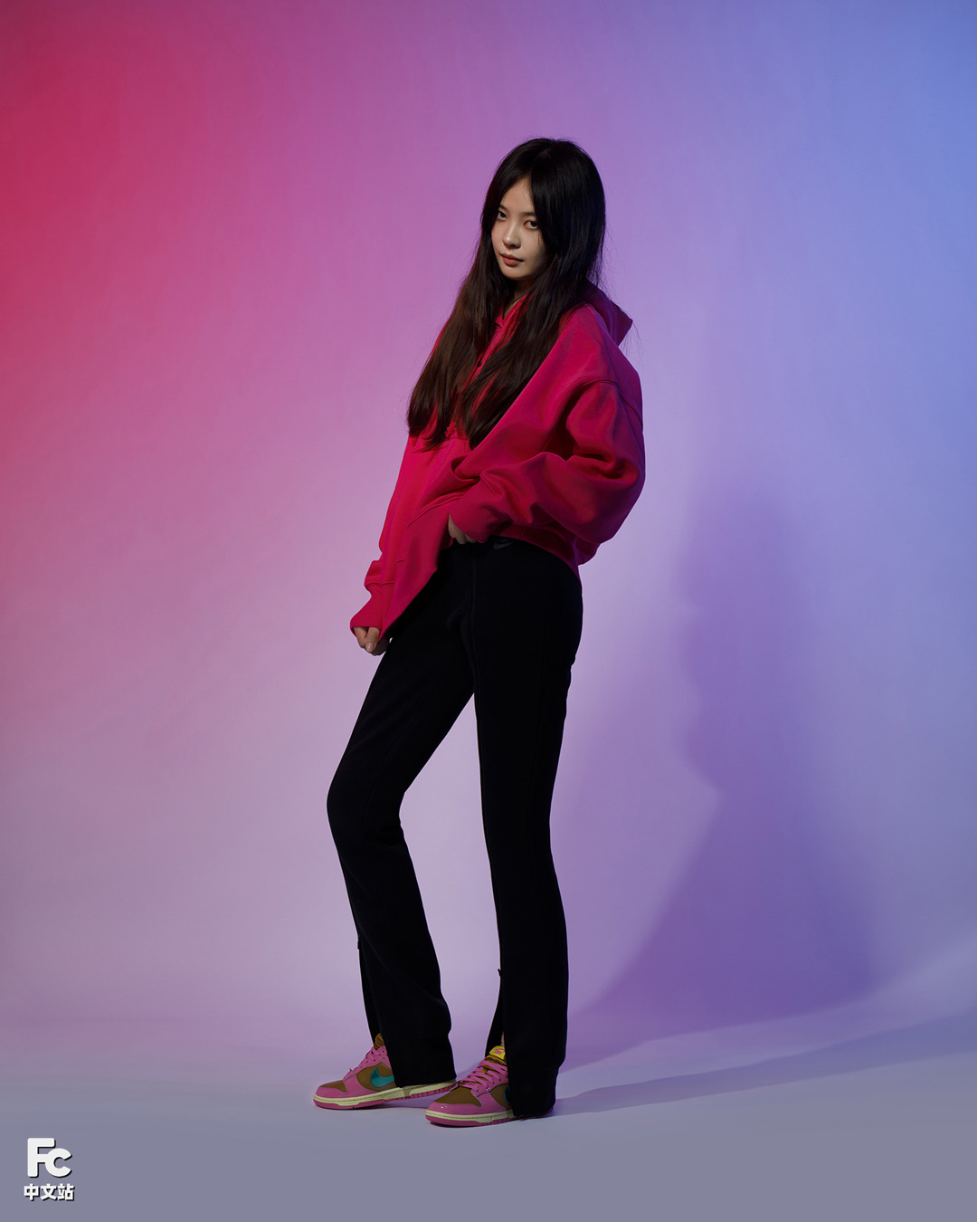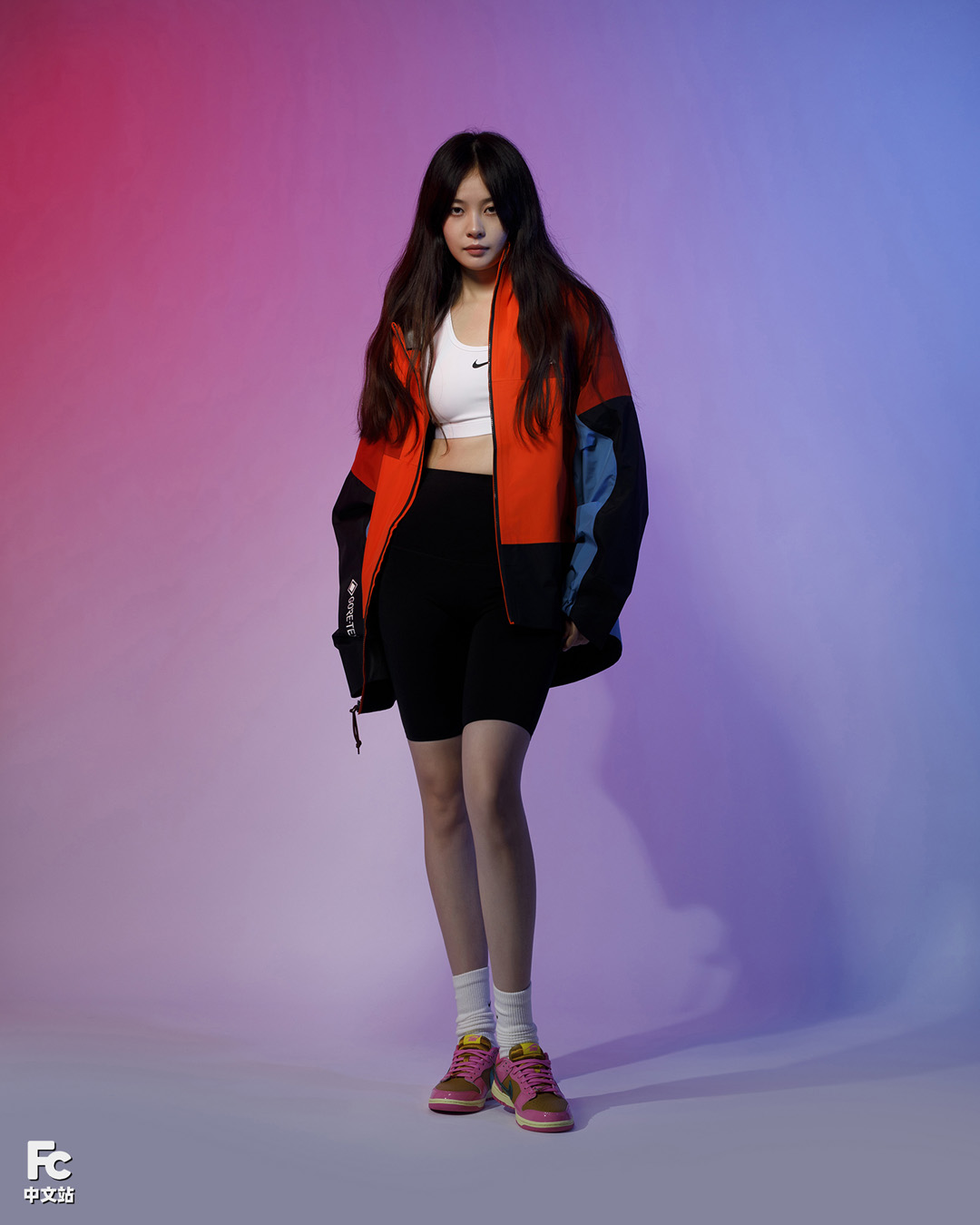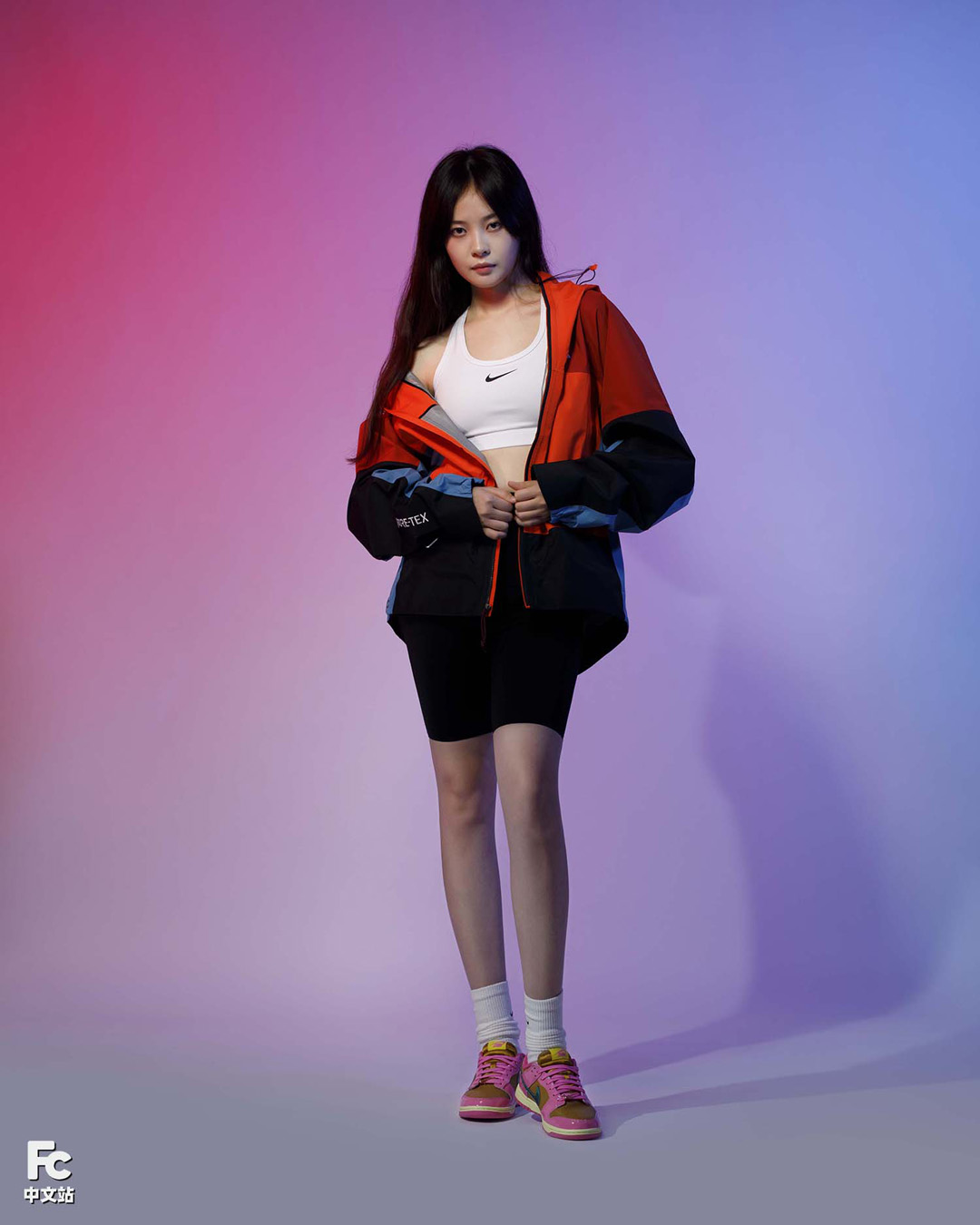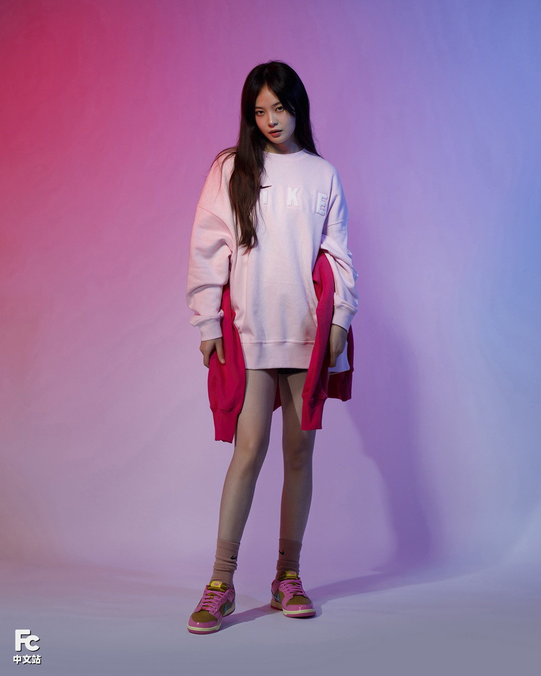 Oversize 版型能有效显瘦,淡粉色也能衬托脚下的 Dunk Low Parris Goebel Quick Strike,如今女生圈子中学习街舞、韩舞的风潮正盛,这身也可以作为舞蹈练习的穿搭。