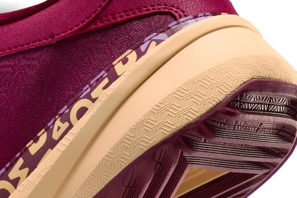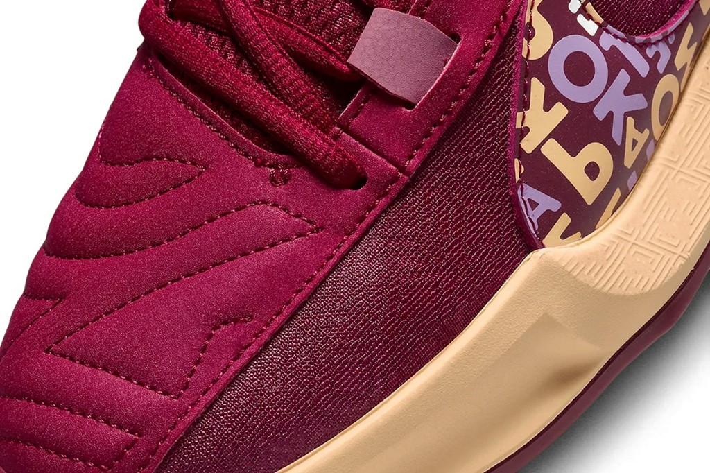 以红色鞋身为主,Swoosh 上印满紫色和奶茶色的字母,整体效果相当吸睛,梗味十足。