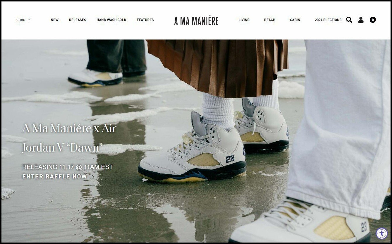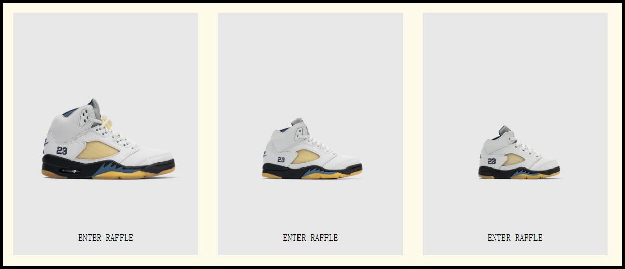 目前,白色款 A Ma Maniére x Air Jordan 5 已经率先在 A Ma Maniére 官网开启登记,将以全家族尺码登场,抽签结果于 11 月 17 日公布。