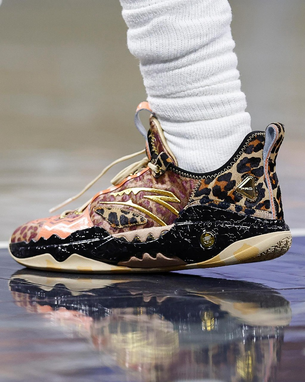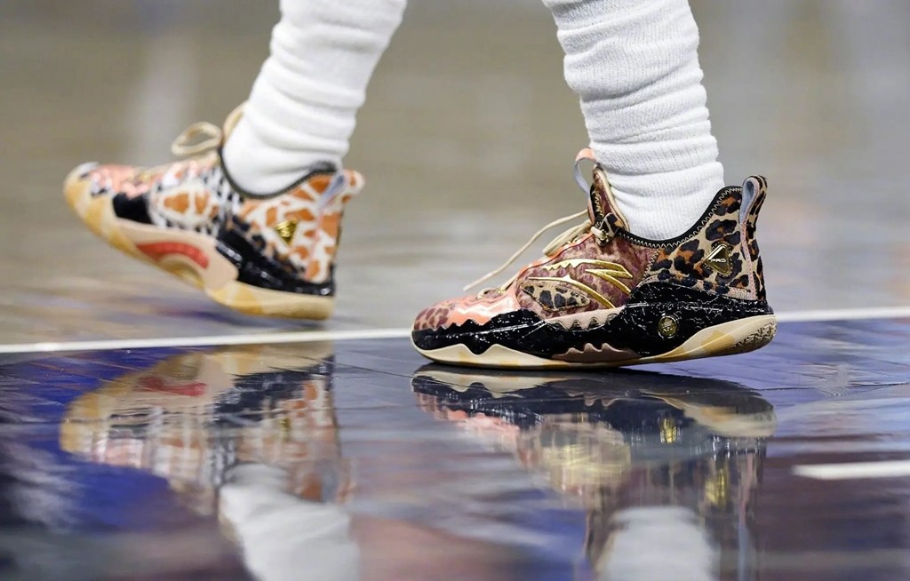 首先就是这双 “猫科动物” 配色,夸张的兽纹充分覆盖鞋面的每一个角落,再配合侧面金色安踏 Logo,华丽程度不言而喻。