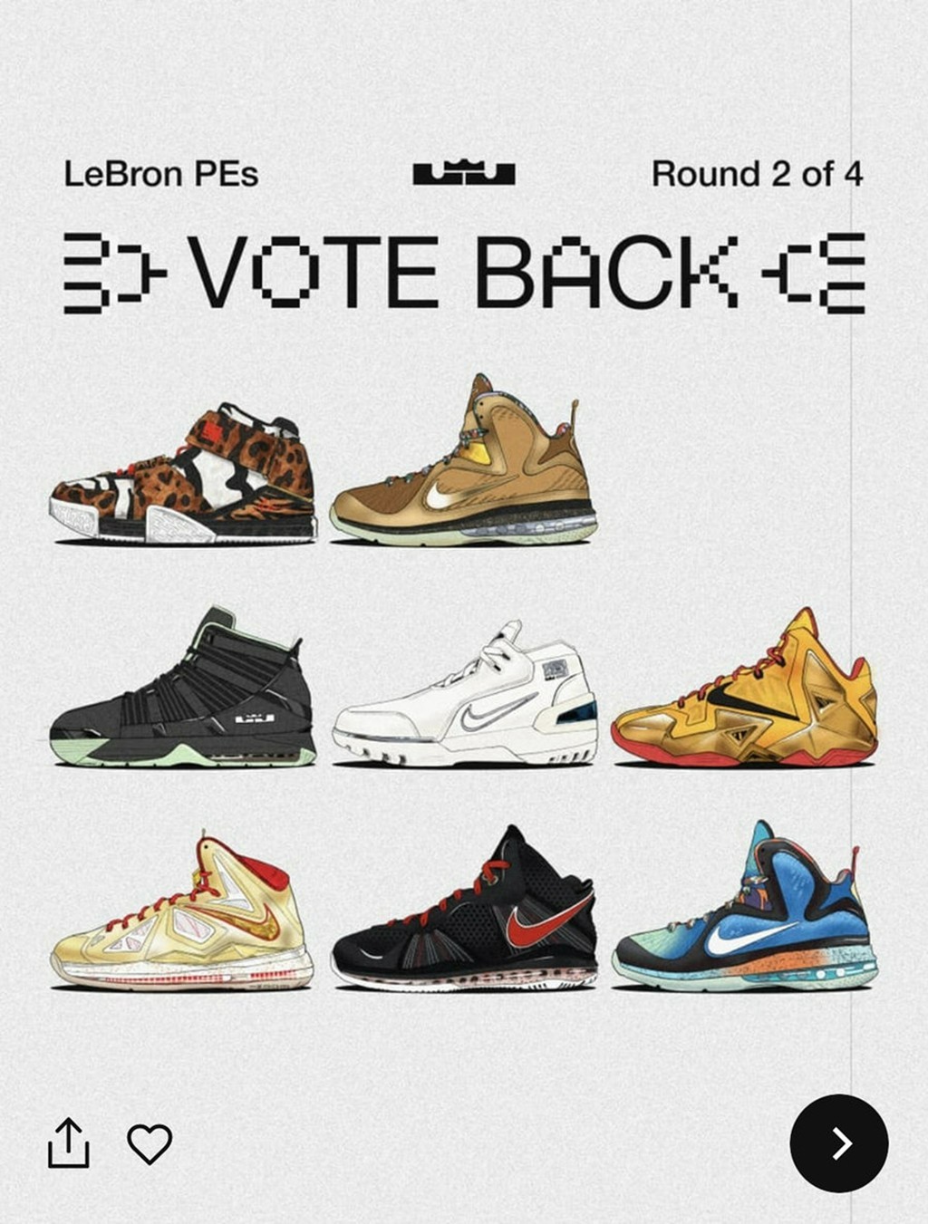 之后这双鞋再出现,便是 2021 年 SNKRS 著名的 “LeBron 战靴投票大会”,虽然最终止步八强,但还是迎来了回归。