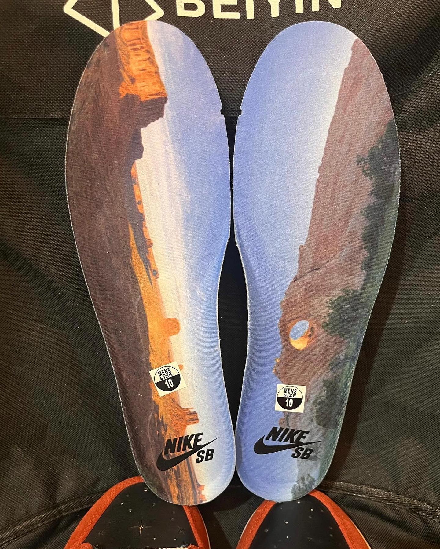 鞋垫处印有 Di'orr Greenwood 的家乡亚利桑那州的山川景象,细节刻画的还是很用心的。