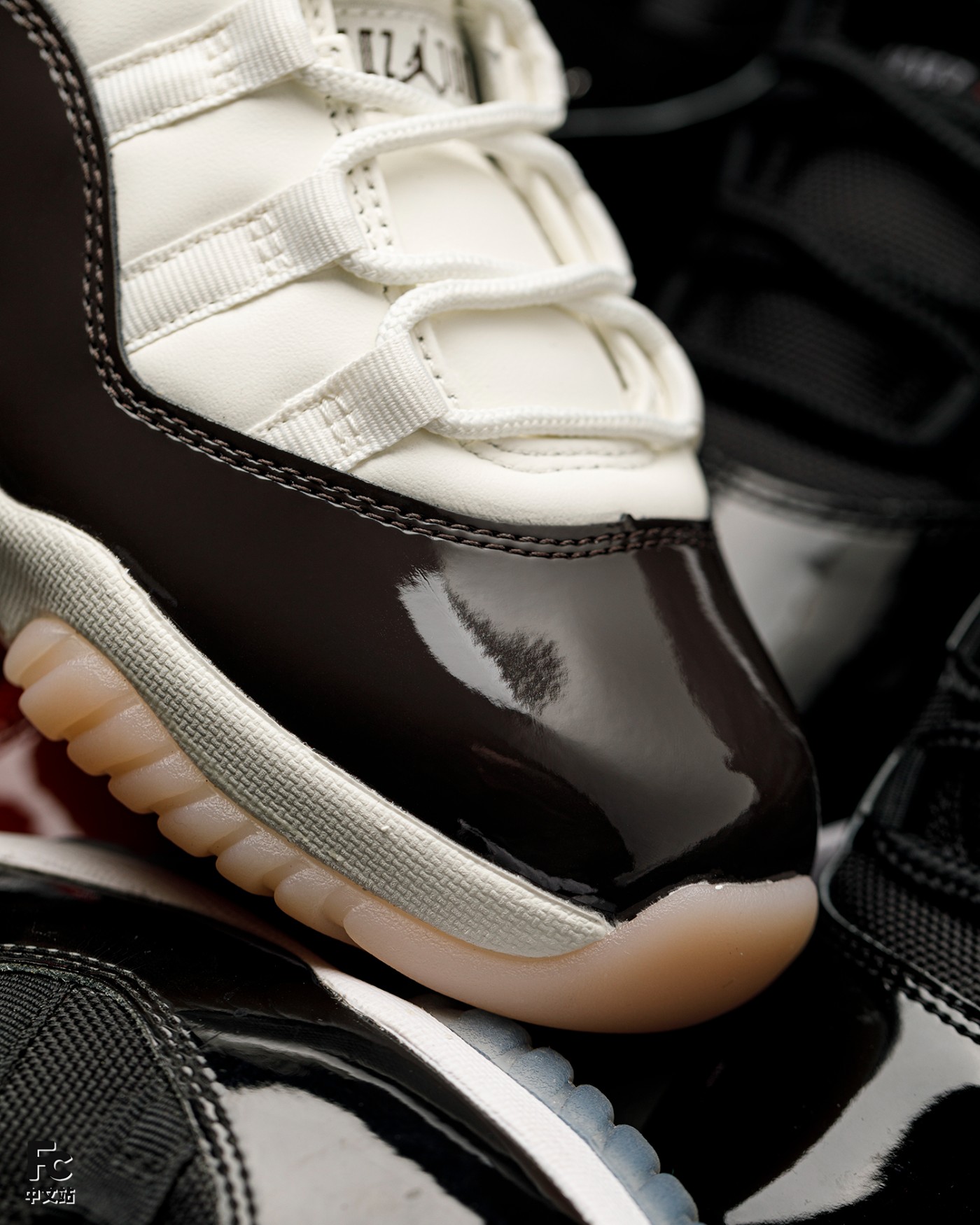 外形遵循 Air Jordan 11 传统设计,同时得益于 WMNS 的规格,仅仅只是将尺码选择范围缩小,对于「大漆皮」鞋型没有任何改动。