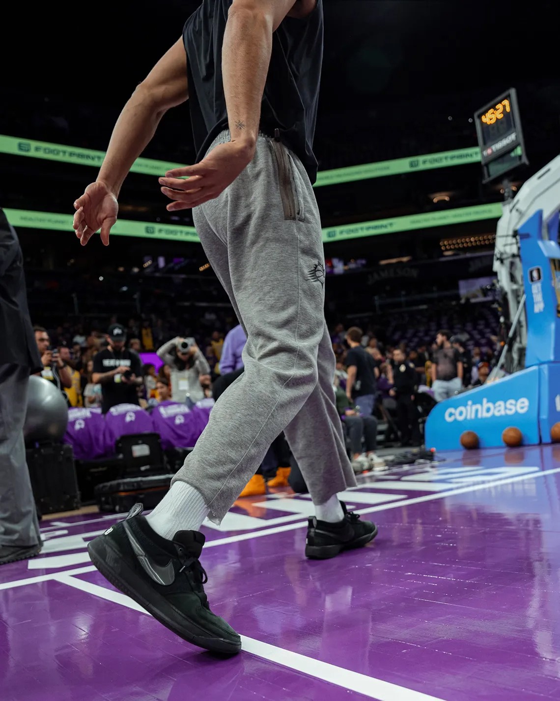 近日在太阳主场赛前训练中,布克又再度上脚一款早期设计测试的 Sample 酷黑版本。