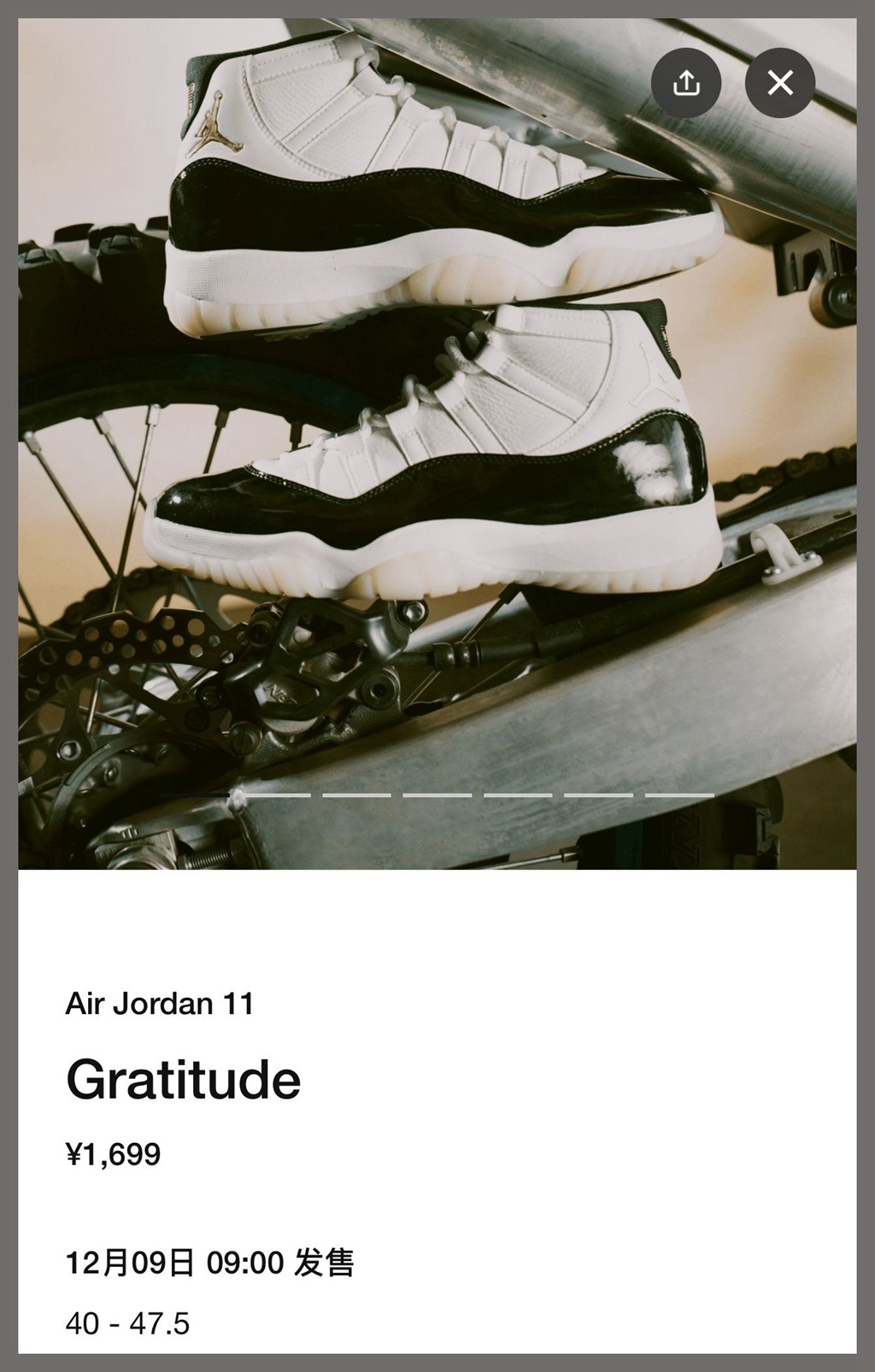 作为今年年底的压轴大戏,无数玩家期待已久的 Air Jordan 11 “Gratitude” 终于正式上架 SNKRS 中国!