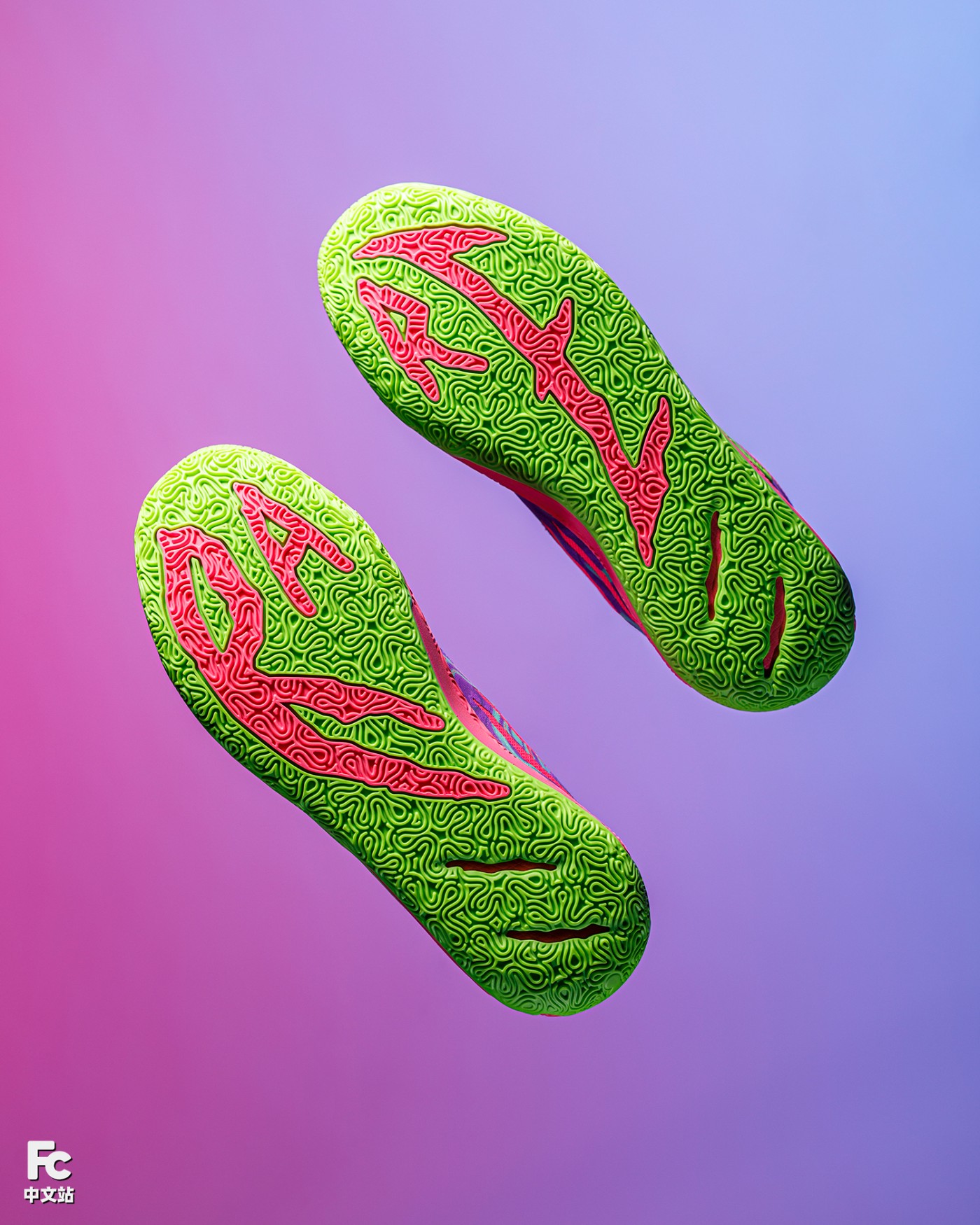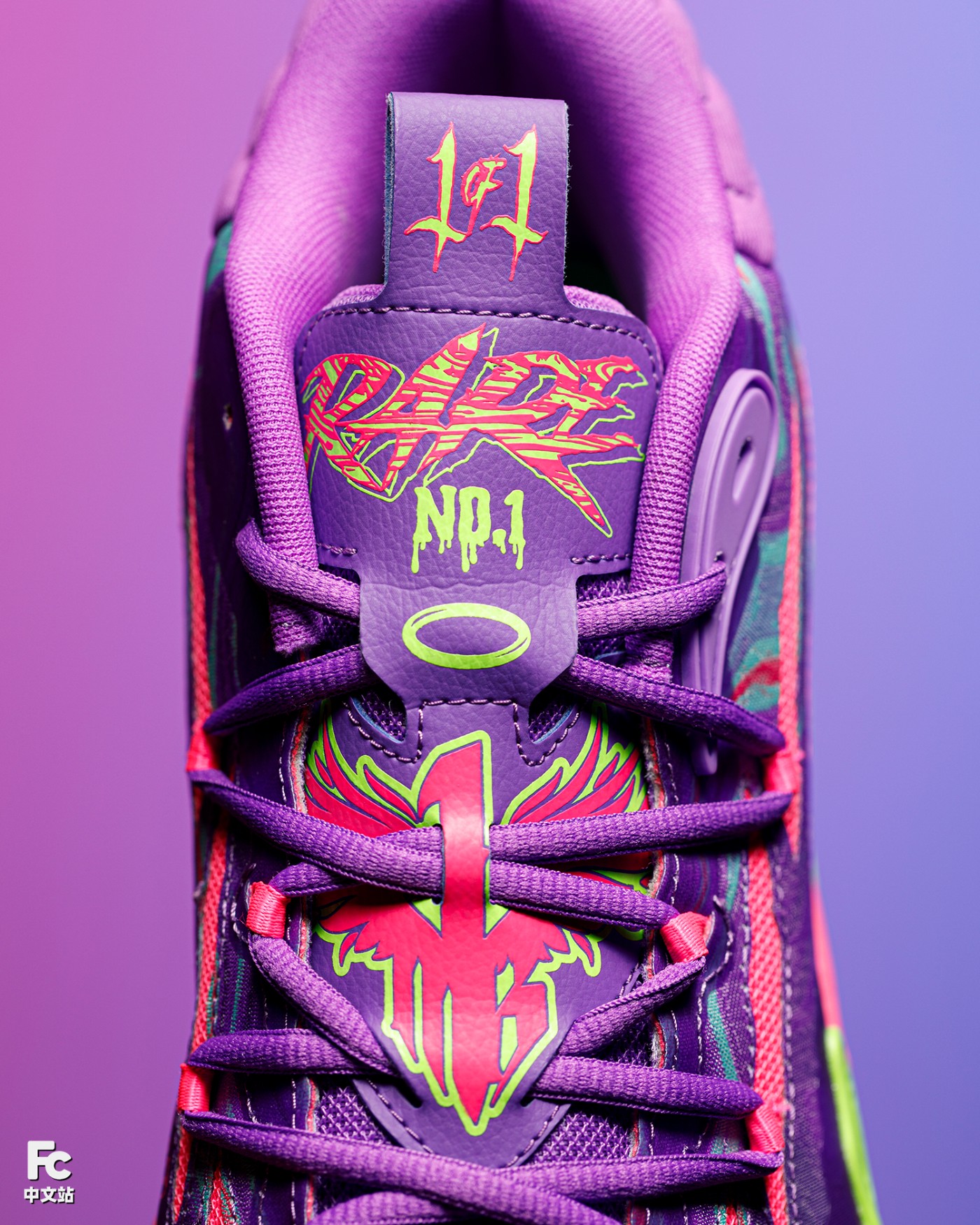 不过最让人心动还是内里的球鞋本身,整体紫色覆盖,中底点缀玫红色,外底直接上了荧光绿色,只能说真的很哇塞,相当迷幻和富有魔力感。