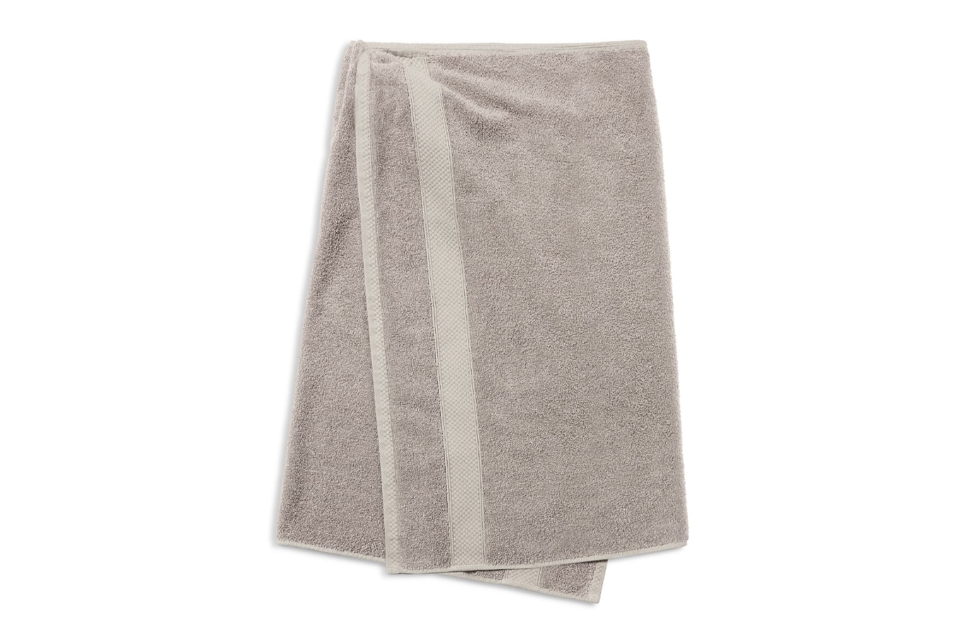 整体外形与普通的灰色浴巾没有任何区别,仅仅是在腰部安装了两个纽扣和一条可调节腰带。