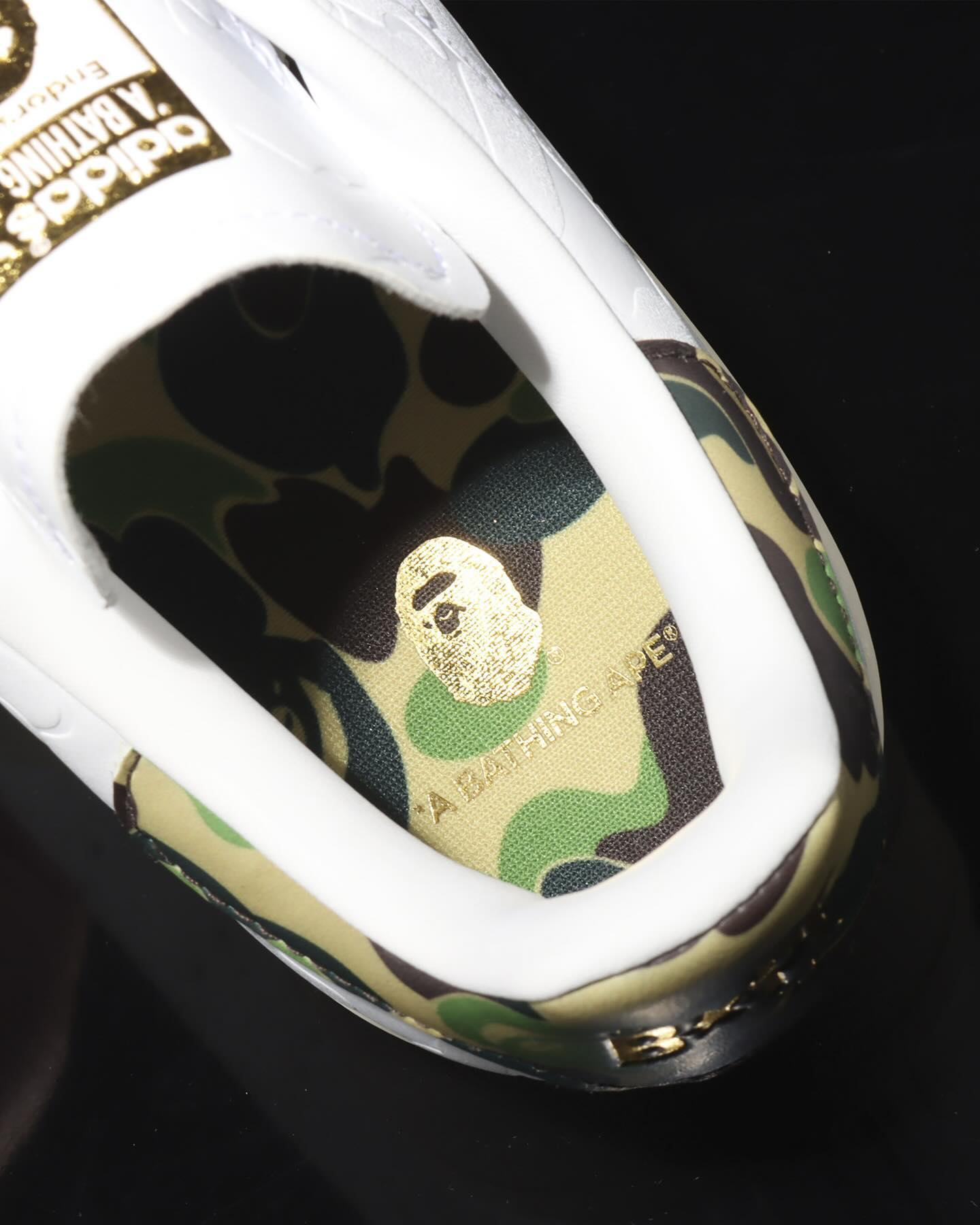 细节方面,除了最传统的鞋舌 Logo 外,还将鞋带扣和后跟换为了极具 BAPE® 风格的造型,进一步彰显联名身份。