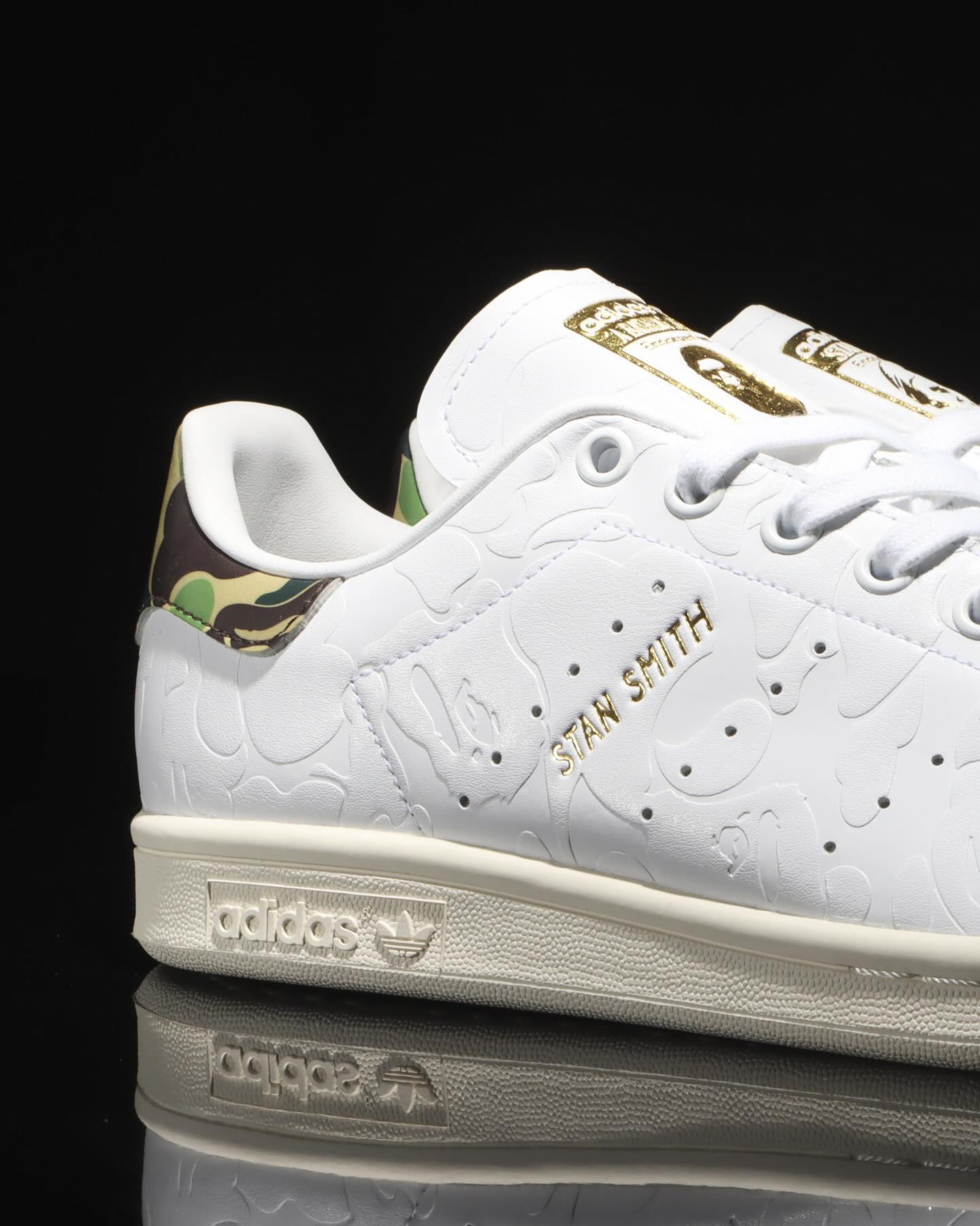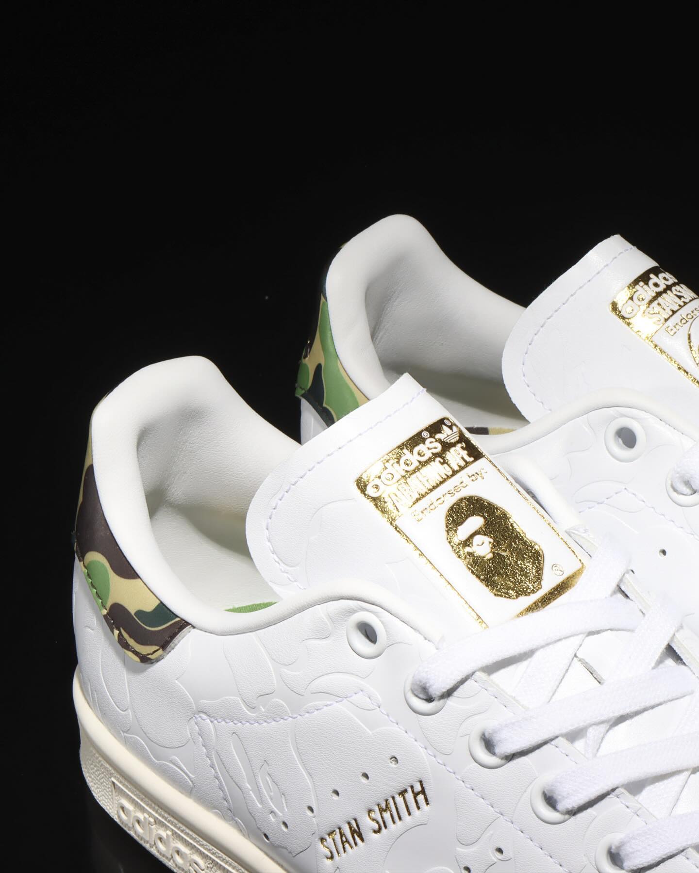 此次双方再度选择了 Stan Smith 为蓝本,最大限度保留原始造型的同时,在鞋身加入压印的 BAPE® 迷彩纹路,视觉效果简约不简单。