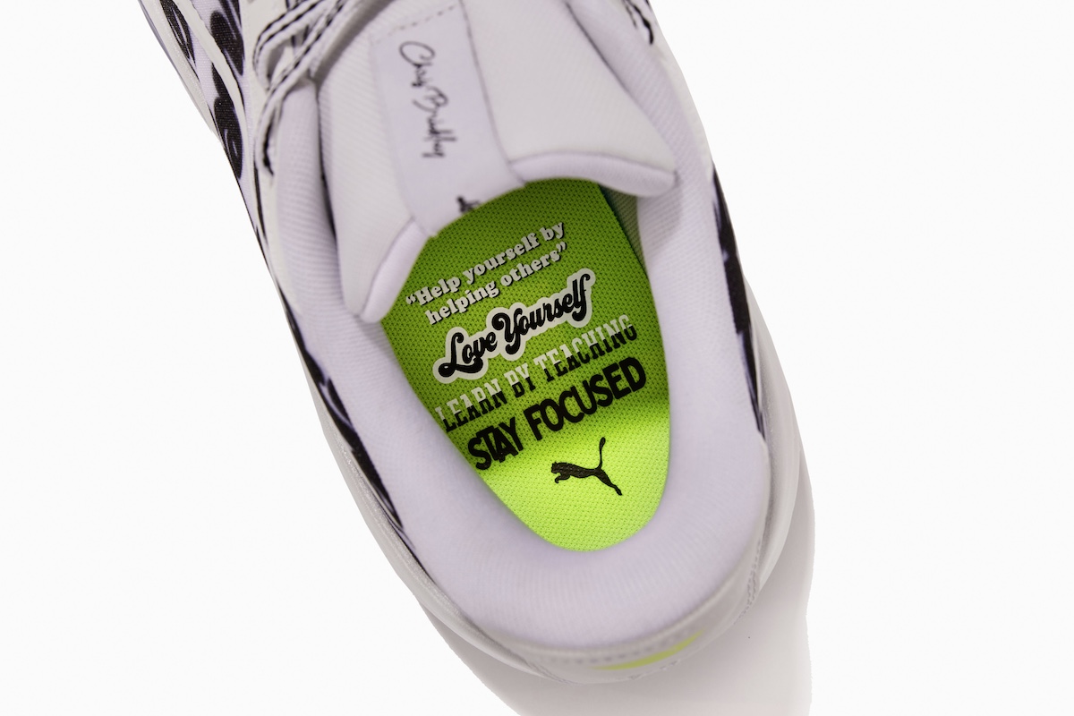 同时鞋面、鞋垫以及鞋底上的印有 “Love Yourself”、“Stay Focused”、“Keep Going”、“Keep Growing” 字样,体现了 Chris Brickley 的原则,彰显鞋款身份。