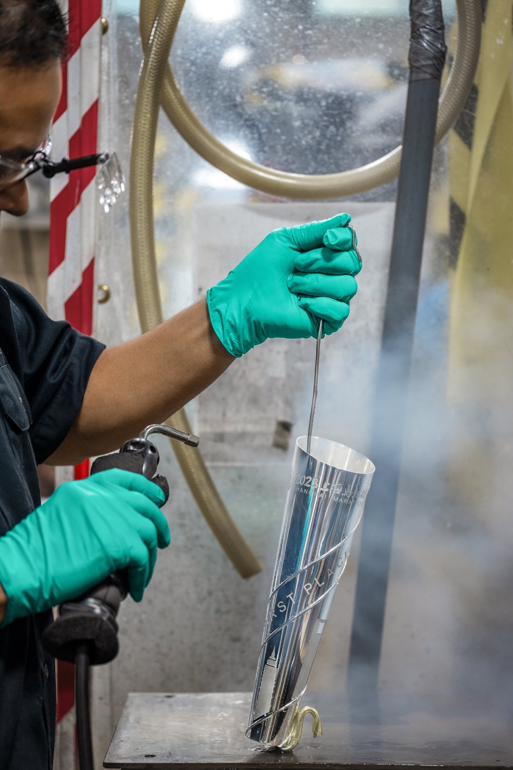 三座奖杯均耗时逾 4 个月制作完成,其中冠军奖杯采用 925 纯银打造,搭配 24K 镀金工艺,呈现约 45.7 厘米的高度。