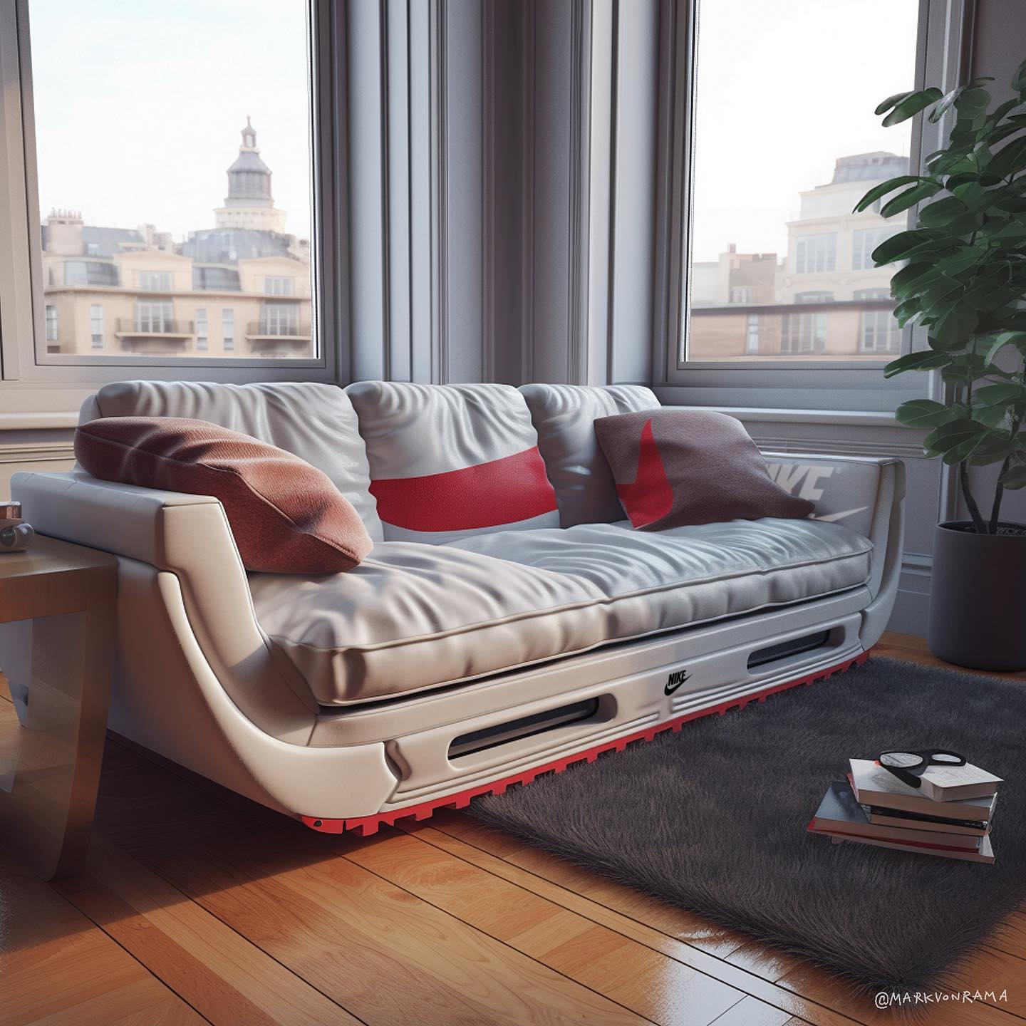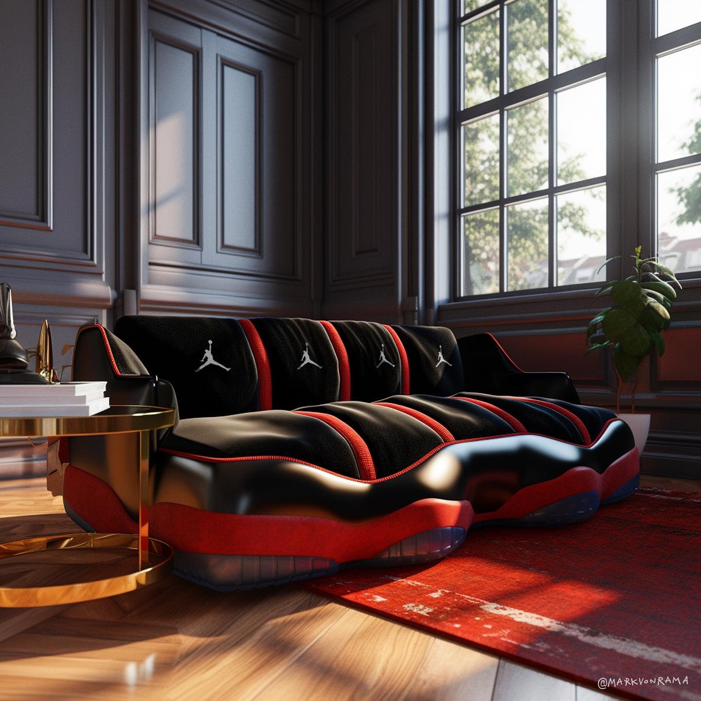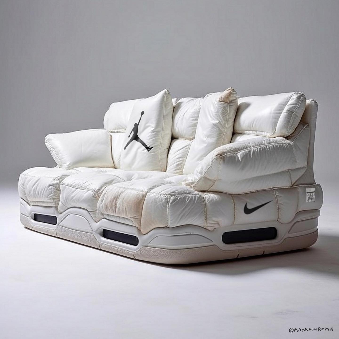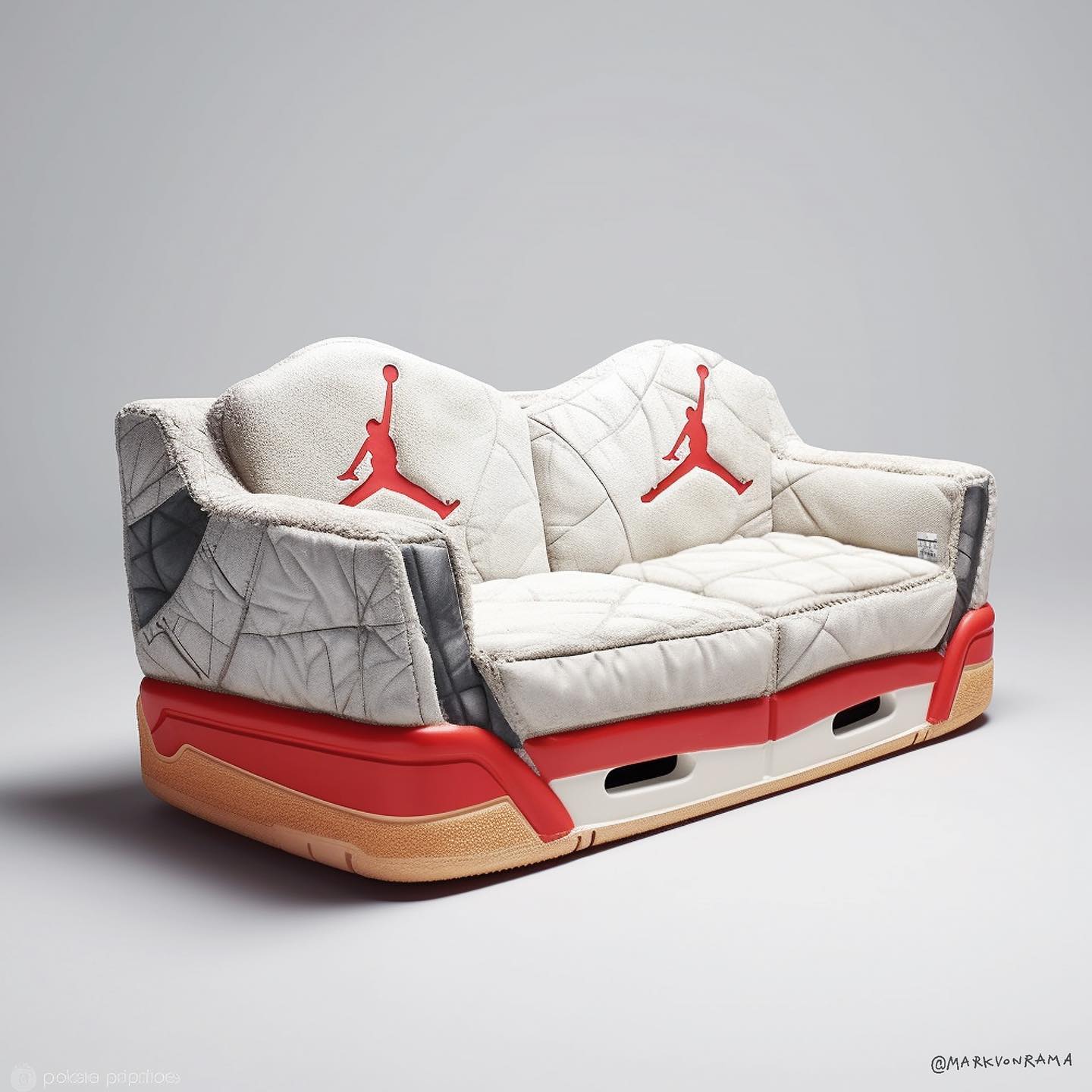 有日子没给大家更新 AI 设计的作品了。 最近,设计师 Marco Rambaldi 再次利用 AI 把球鞋设计成了家居产品。 灵感来源于大家熟知的 AJ3、AJ4、AJ11、Air Max 1 等经典鞋款。 这些沙发真的是看着就诱人,小编已经开始想象坐上去是什么感觉了。 除了靠垫装饰的飞人 Logo,更还原了标志性的中底开窗气垫,并且鞋身绑带、TPU 造型鞋带孔都悉数呈现。 这样的沙发摆在家里,是不是才能匹配你球鞋玩家的身份? Pic via:markvonrama