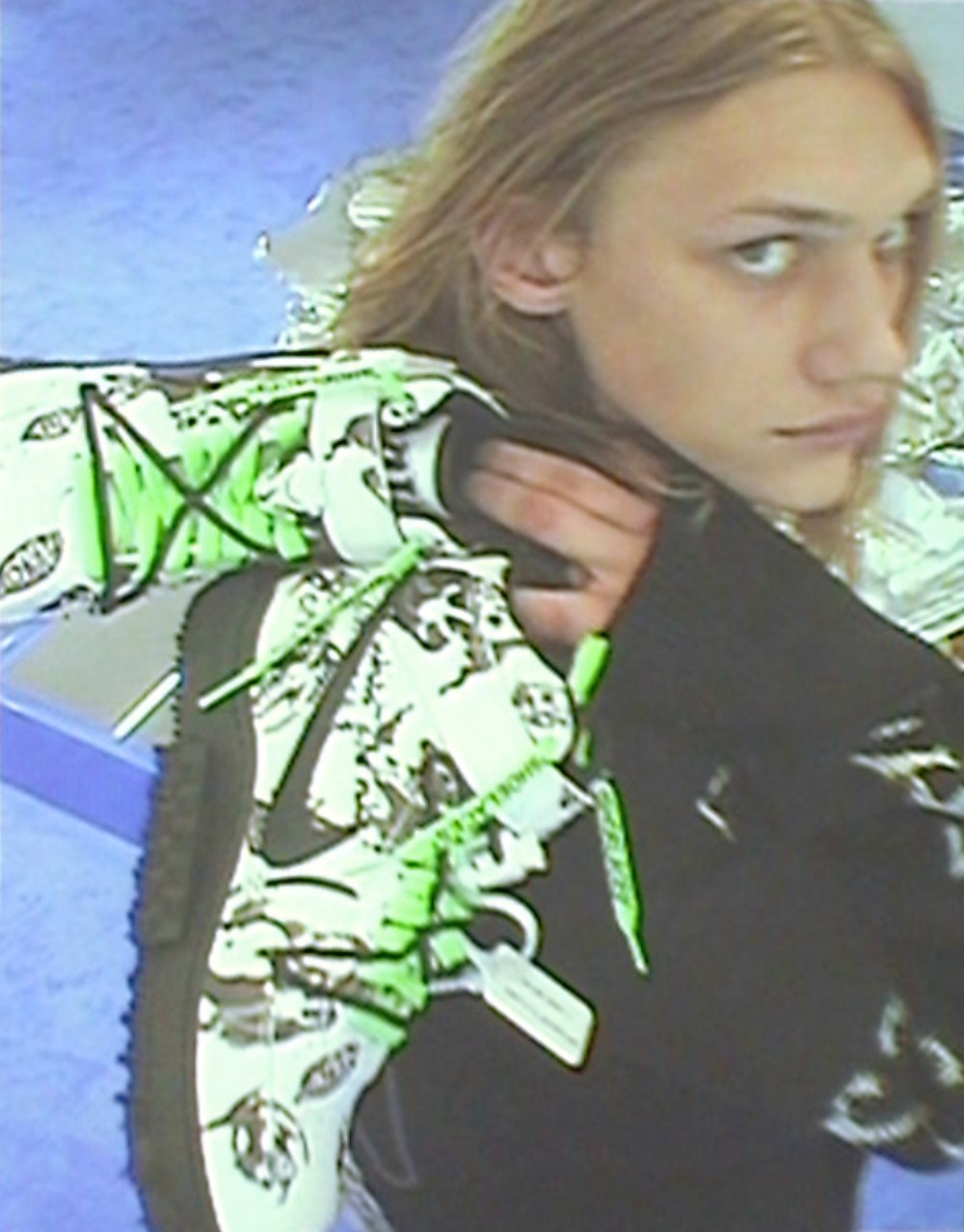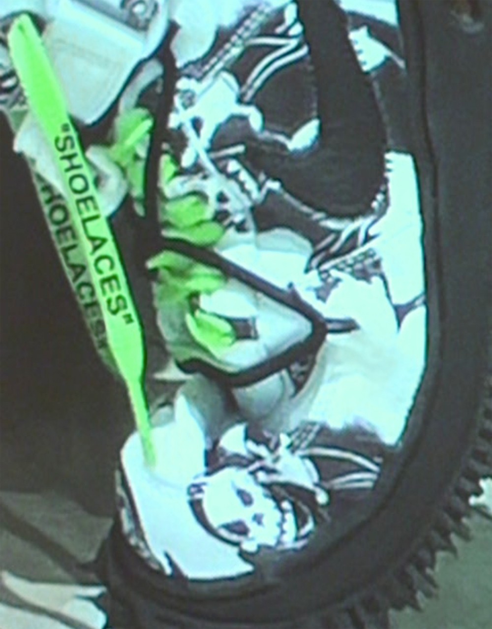 设计方面大家很熟悉了,保留了经典解构风格,最大的不同则是鞋面印花,图案均为 Virgil 亲手创作的板画。