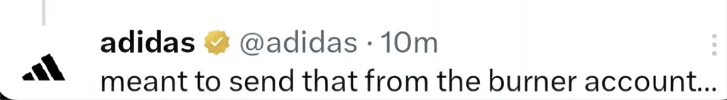 不过很快,adidas 便删除了这条流言,紧接着补充道:“本来打算用小号发的 …”