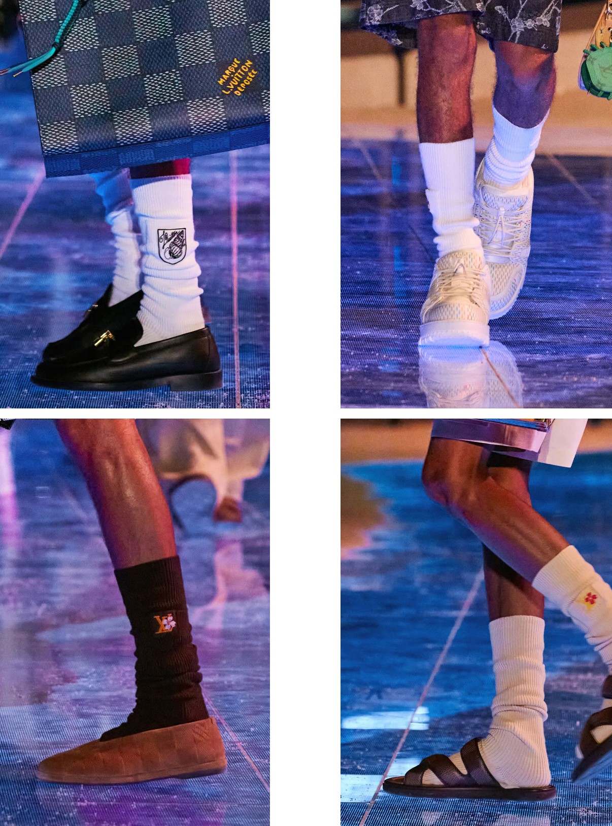 LV Space Lander 便鞋首次以绒面革和丹宁布材质亮相,LV Venice 凉拖采用渔夫凉鞋廓形,呈现 Damier 棋盘格纹理。