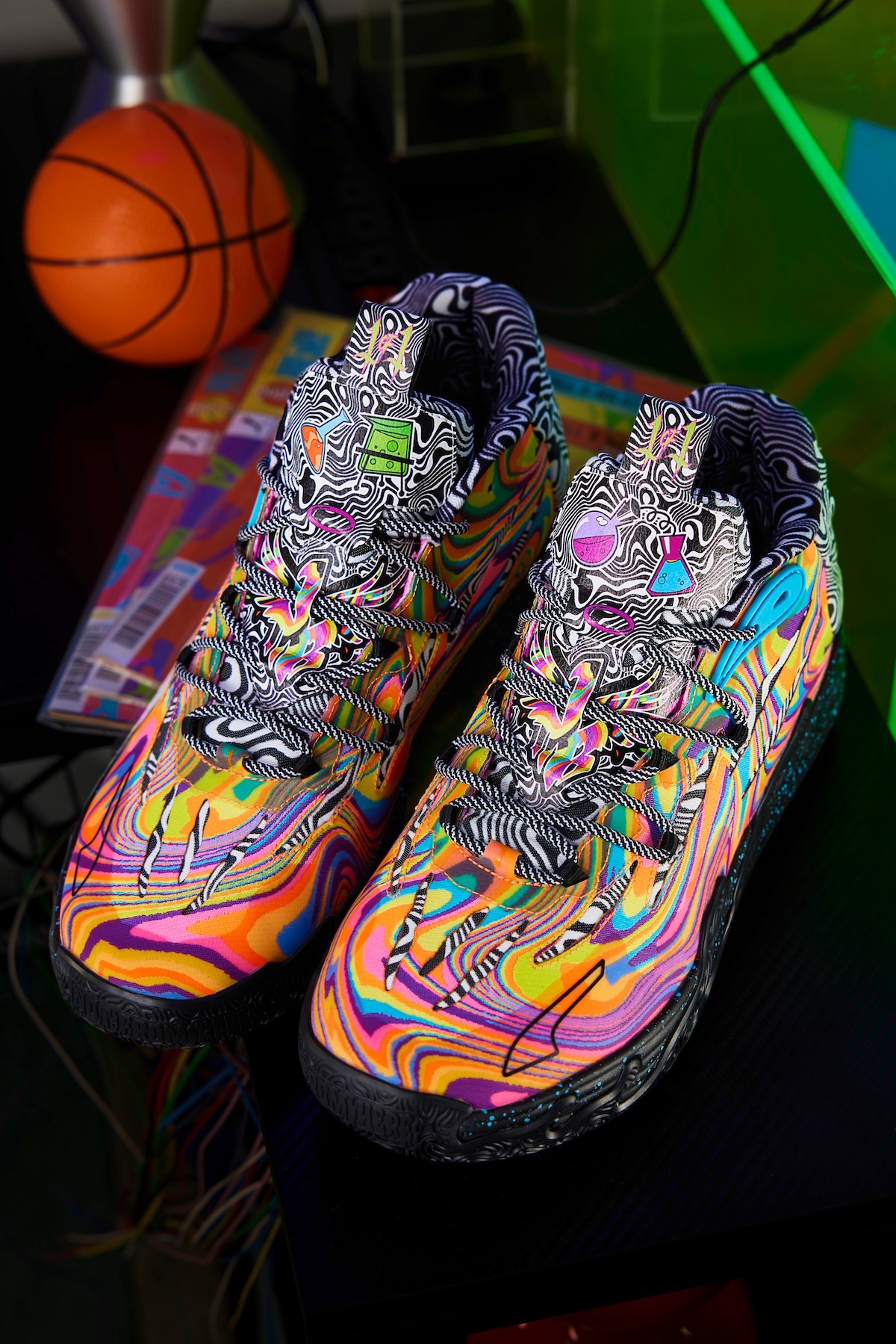 并在鞋舌处印有动漫相关的实验室器皿等等,彰显鞋款身份。