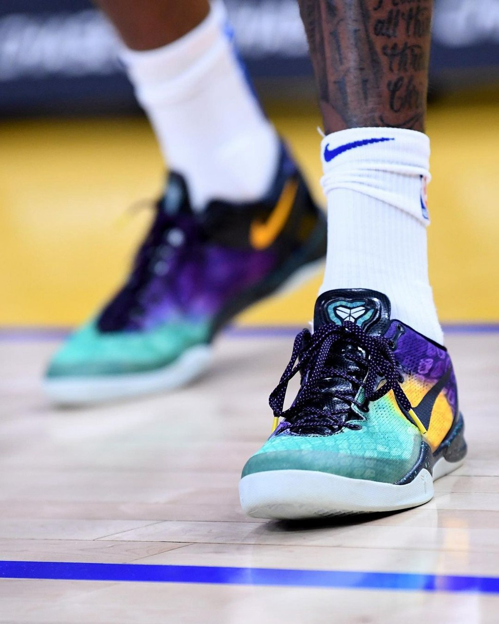 值得一提的是,哈里伯顿作为资深科蜜,今天特地上脚了一双定制版 Nike Kobe 8 Protro 来致敬科比。