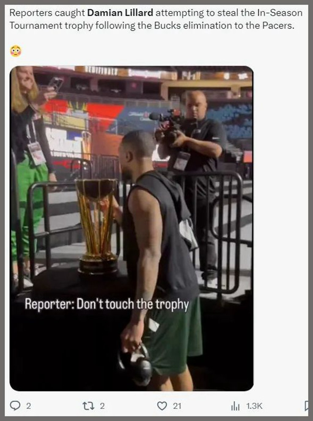 其实今天赛前,利拉德对季中赛奖杯十分好奇,想上手摸摸,结果背后的记者提醒他:“别提前摸奖杯!会带来厄运!”
