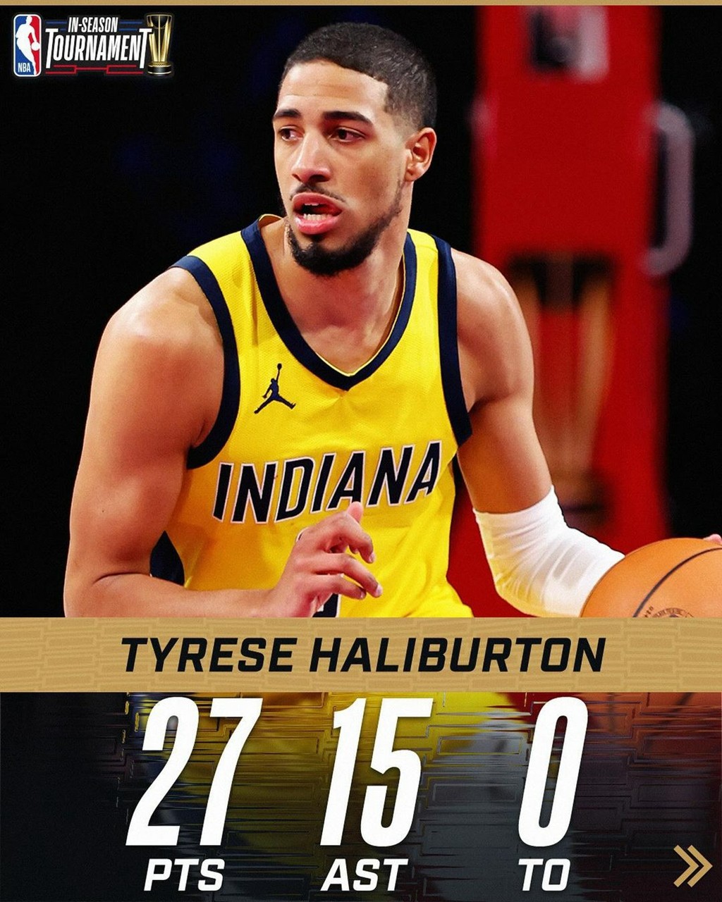 哈里伯顿此役疯狂砍下 27 分 15 助攻并且全场 0 失误,比肩保罗、纳什等一众 NBA 名宿。