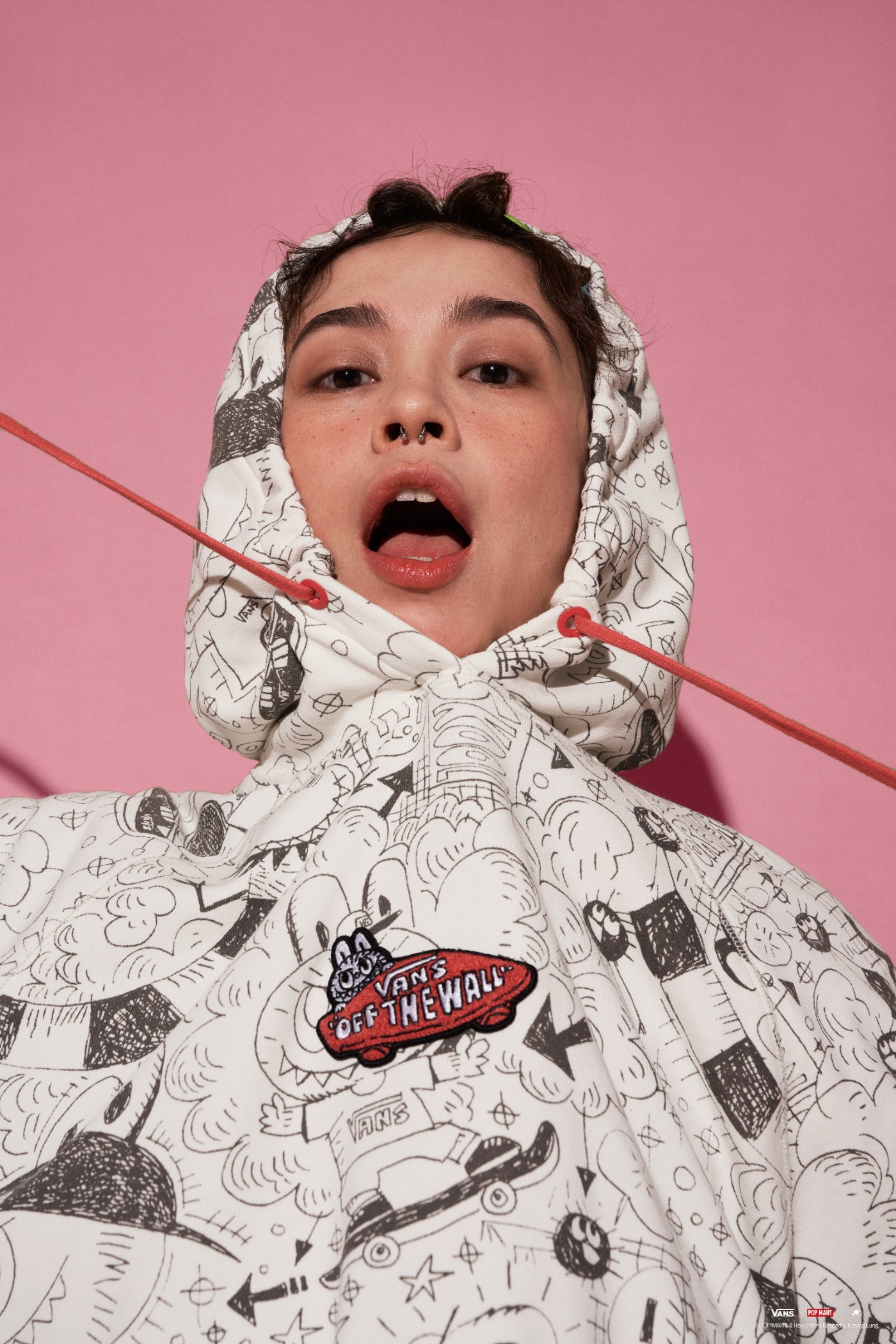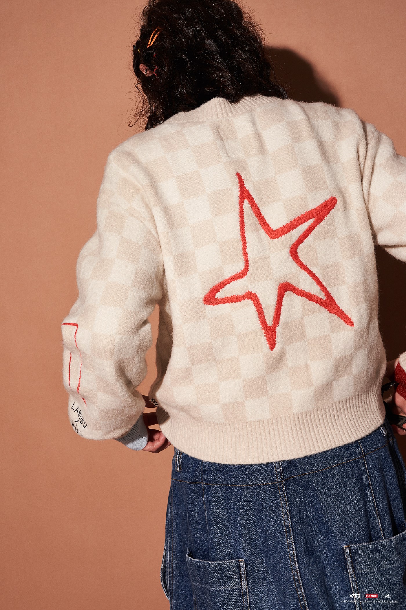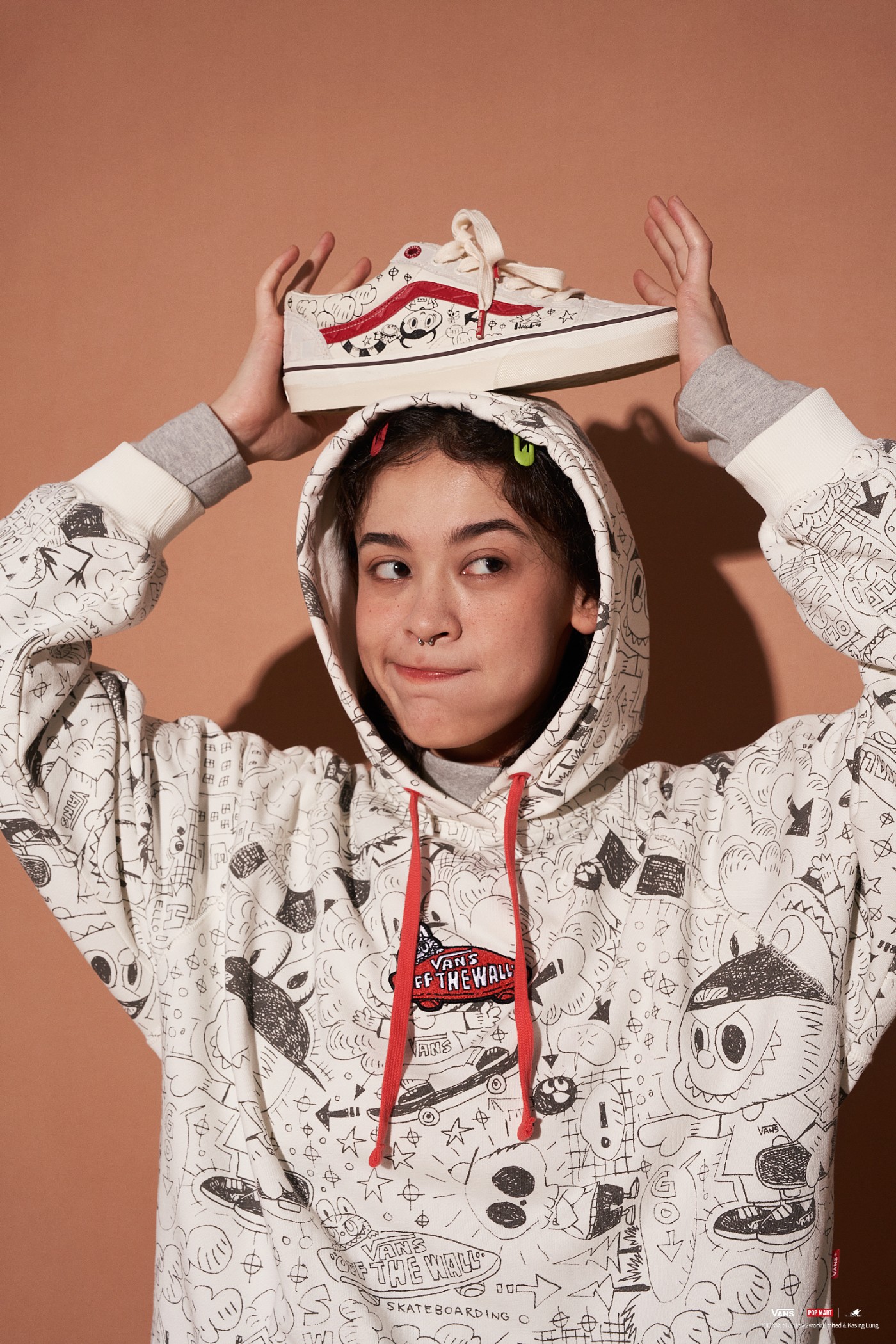同时在鞋腰处印有黑白线条 “LABUBU” 古灵精怪形象及滑板元素,鞋身其他部位则满铺同色调棋盘格元素。