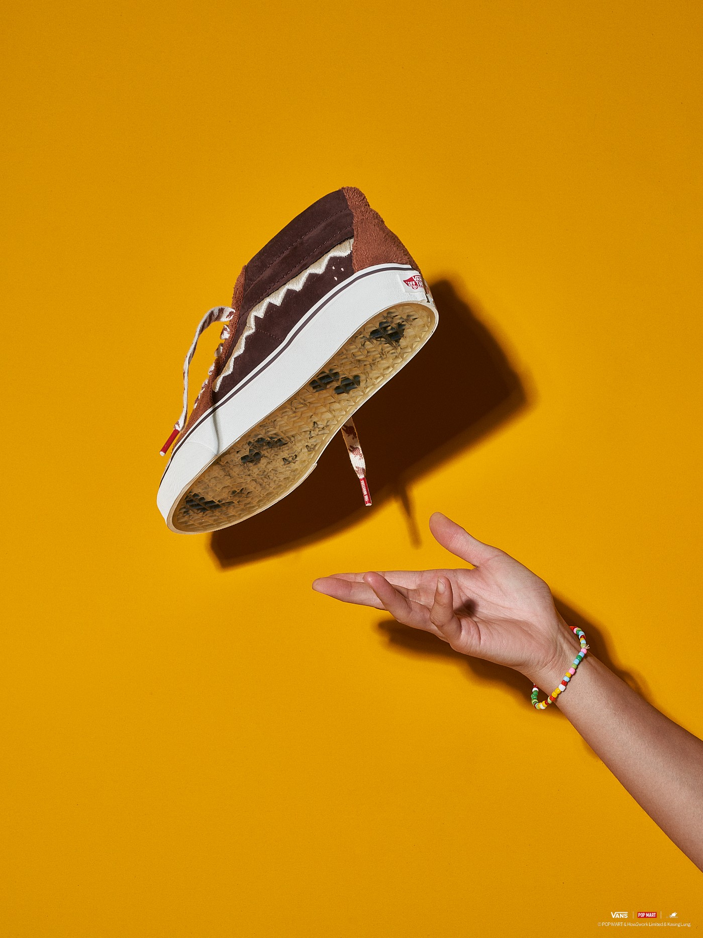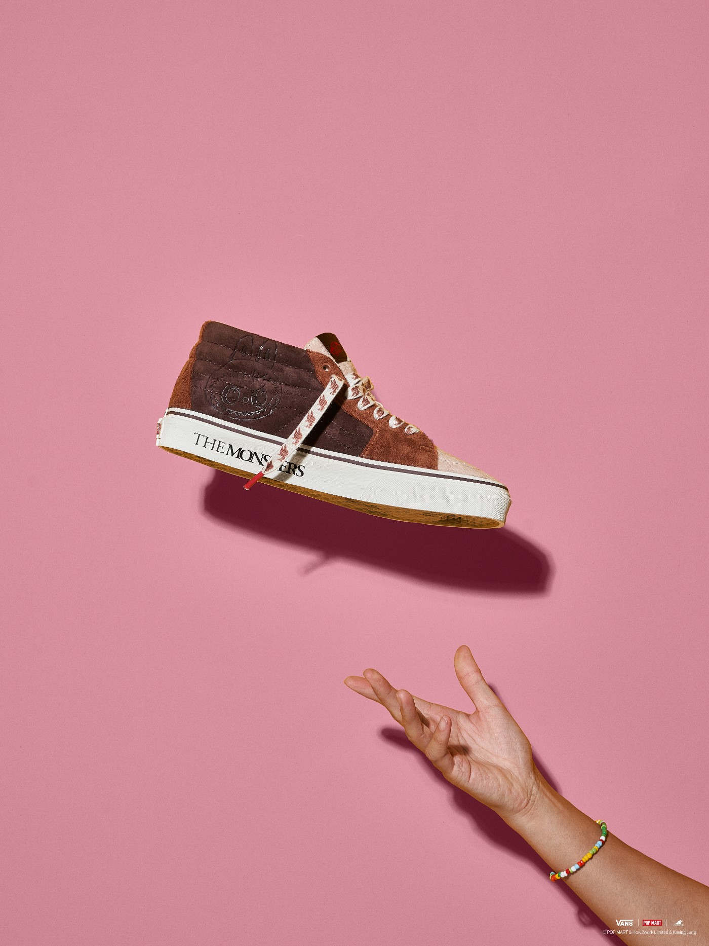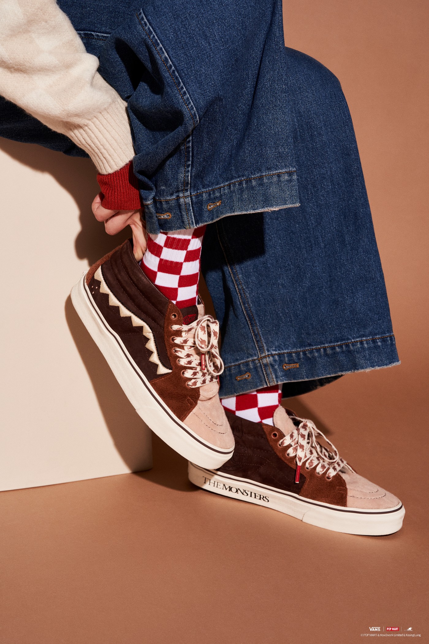 Sk8-Mid 鞋款选用 “LABUBU” 此次形象主色调,整体配色为棕色系,搭配白色锯齿状侧边条纹进行趣味呈现。