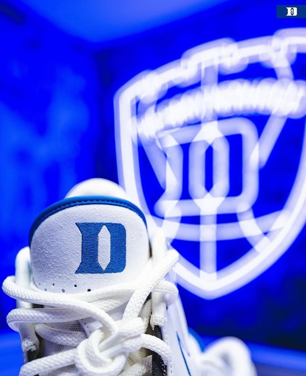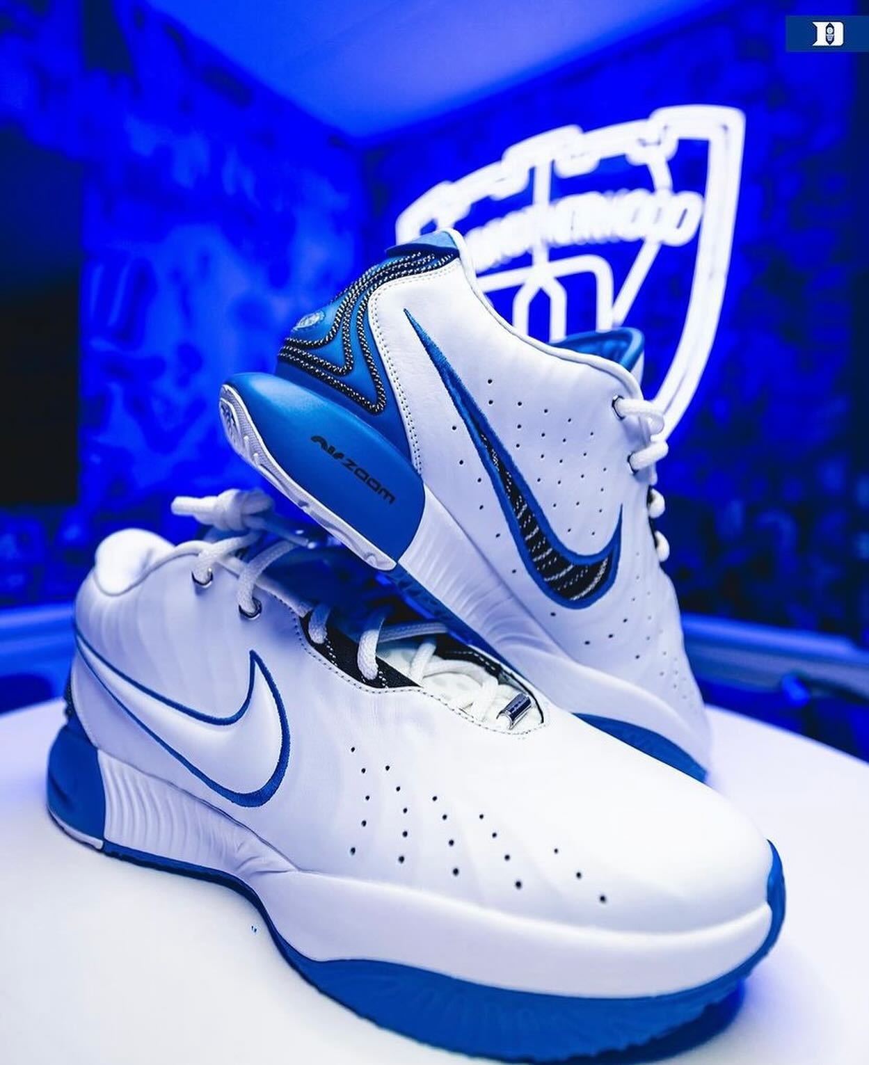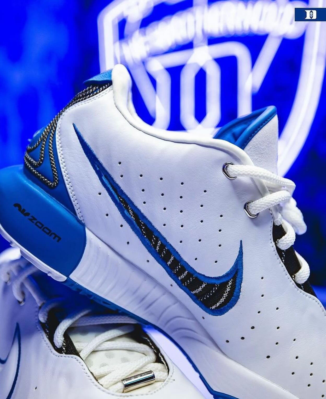 本次的杜克大学 PE 配色共有三款,先说老詹上脚的这双,整体大面积蓝色覆面,后跟处白色点缀,呈现出杜克大学球衣配色。