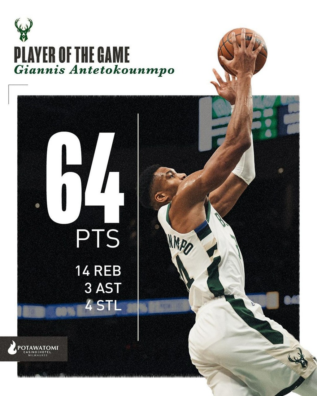 比赛过程也固然精彩,字母哥撕碎了步行者的防线,狂砍 64 分破队史记录,成就了又一个里程碑之夜。