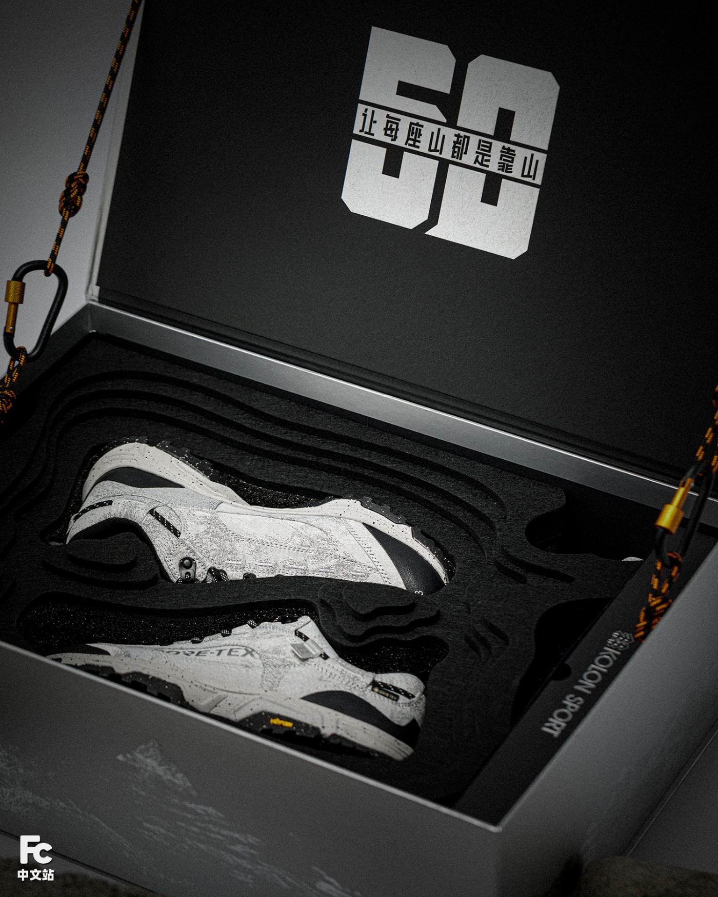 打开礼盒,「可隆 50 周年纪念款 MOVE 徒步鞋」镶嵌于等高线模拟的群山中。