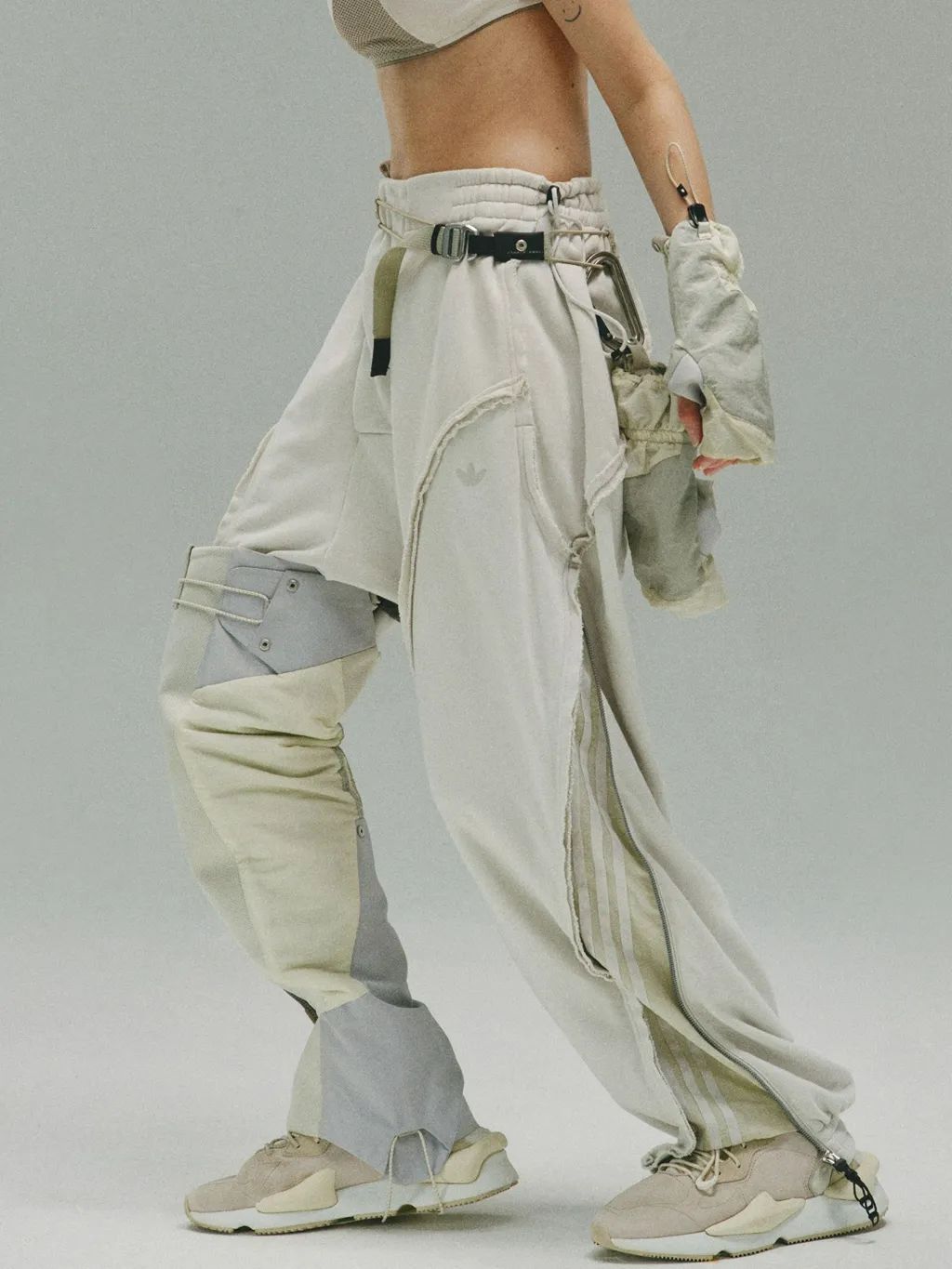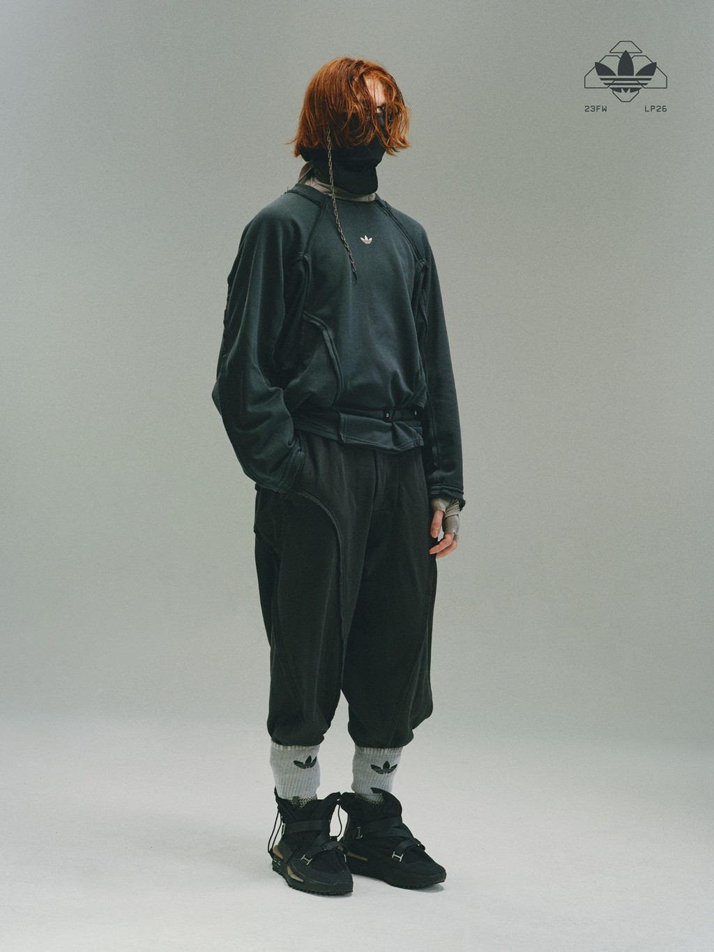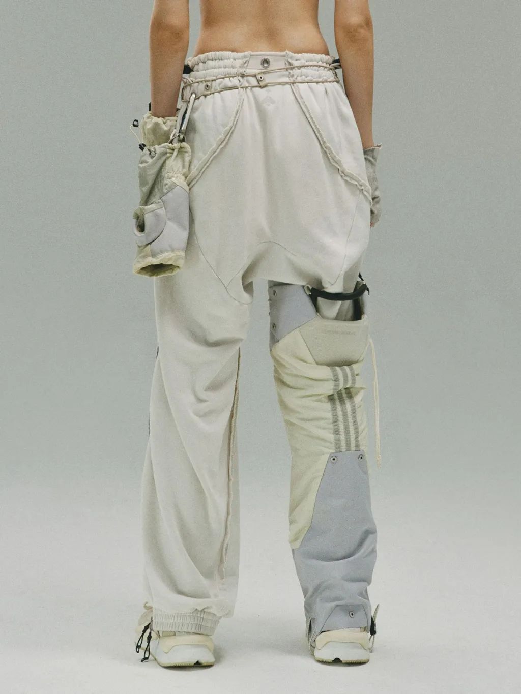 下装方面,JEJE 选择了外露拼骨通勤长裤,外露的毛边拼缝工艺突显废土气质。