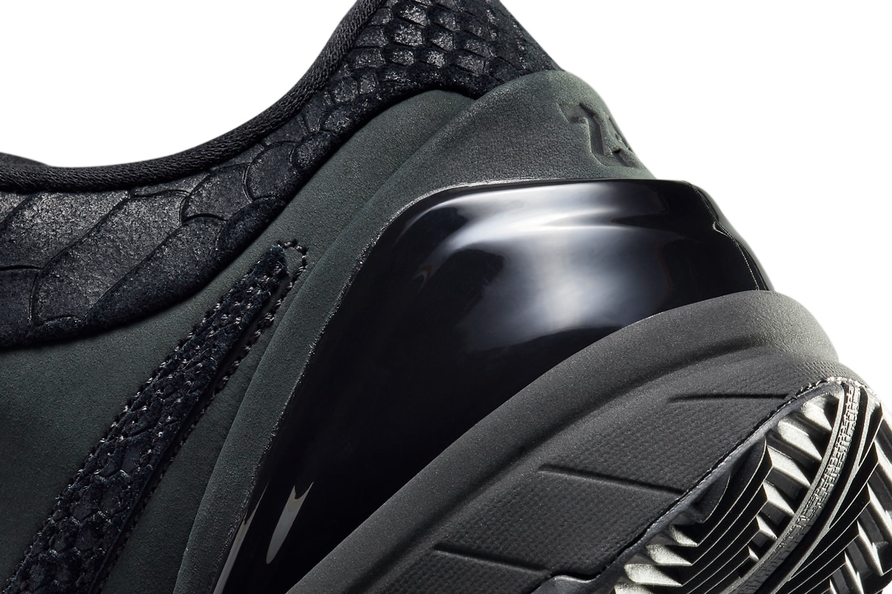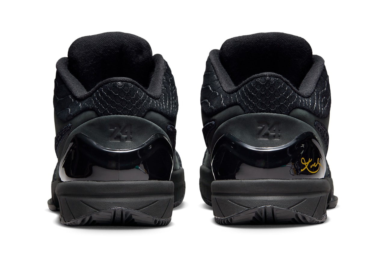 鞋身一袭黑色调呈现,仅在后跟位置点缀金色科比签名。