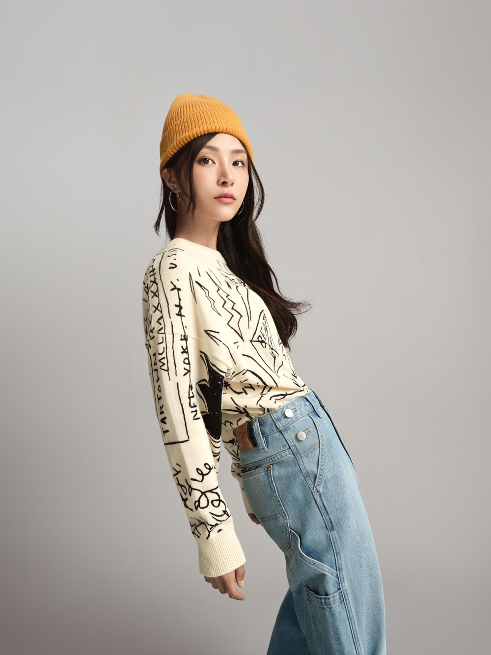 除了 Lee 标志的丹宁产品外,本季还配有季节性剪裁设计的全身印花毛衣。