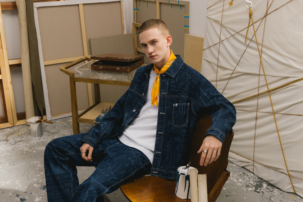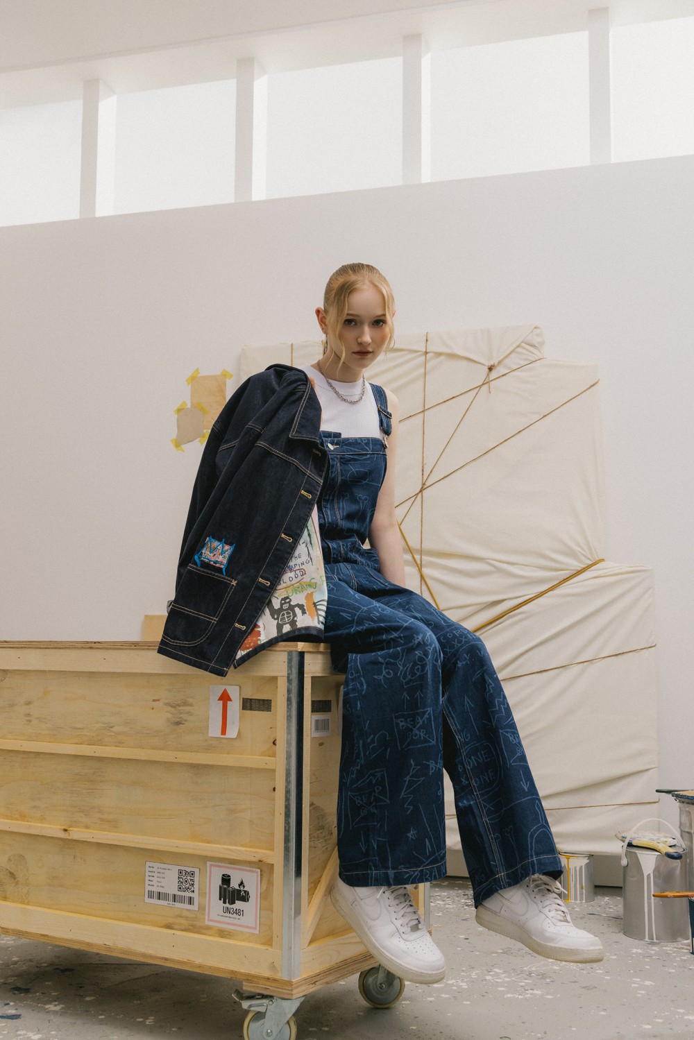 牛仔夹克是内里印有 Jean-Michel Basquiat 彩色画作的宽松清洗水牛仔外套,搭配全身印花工装背带裤,含蓄而不经意地流露出艺术品味。