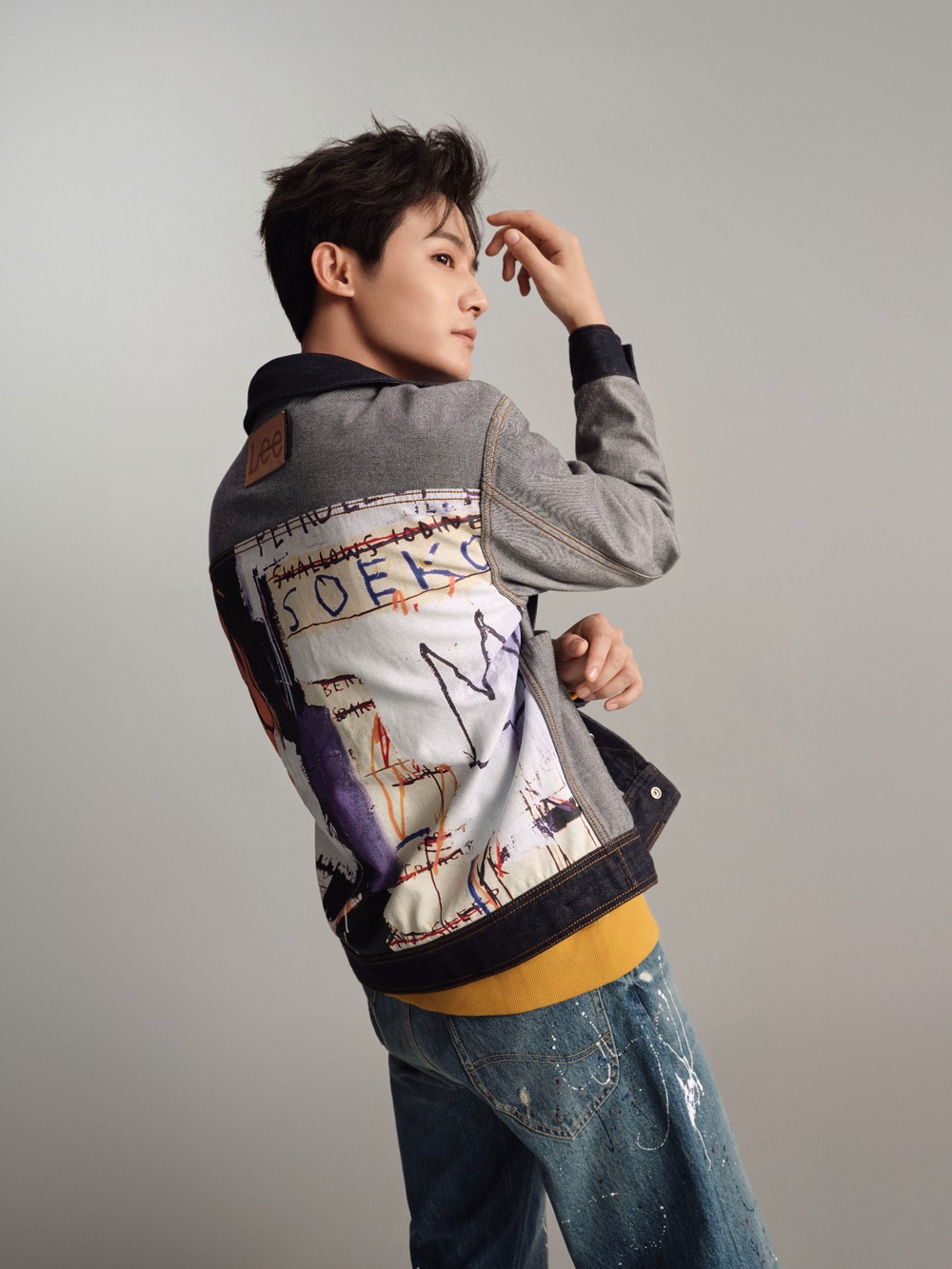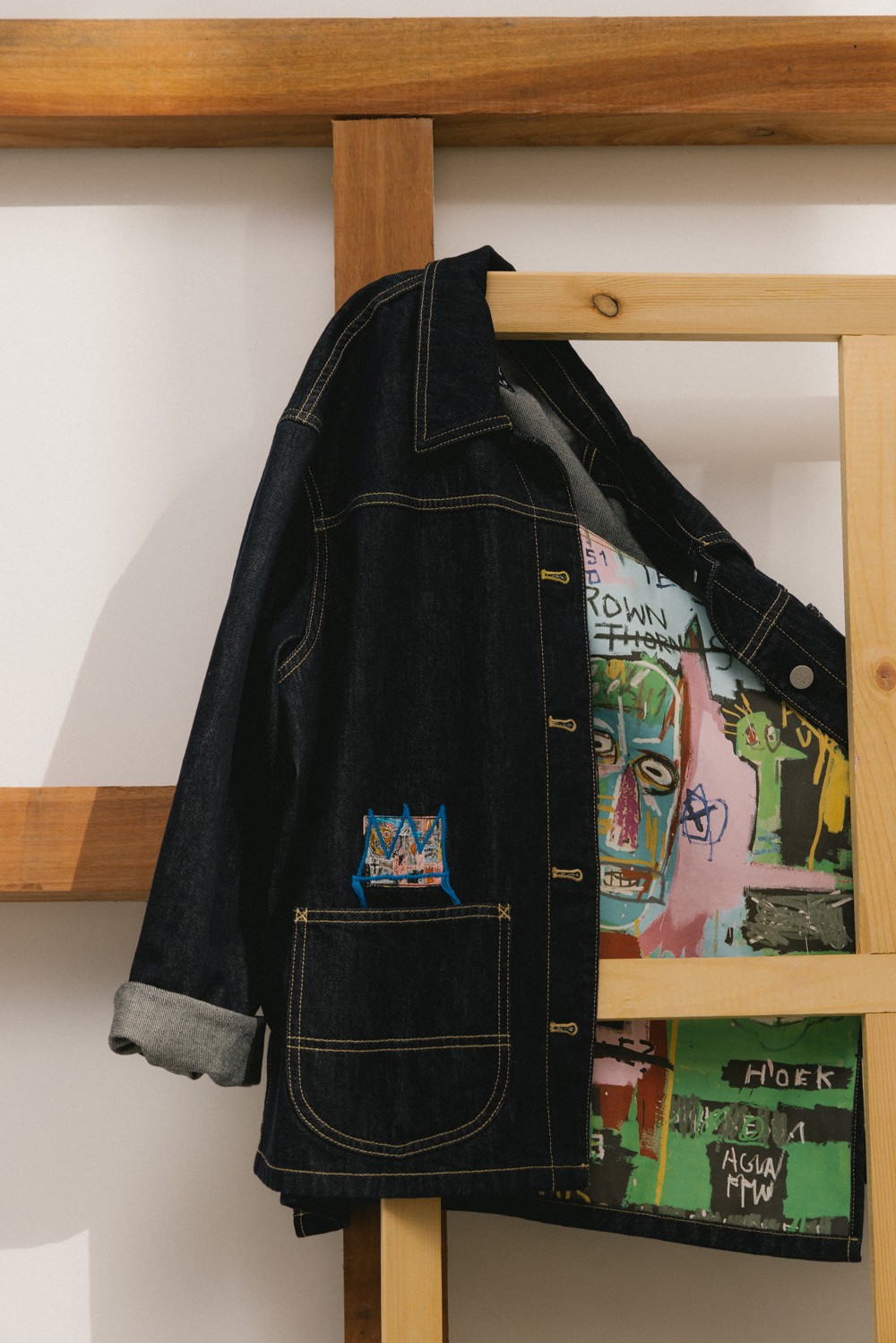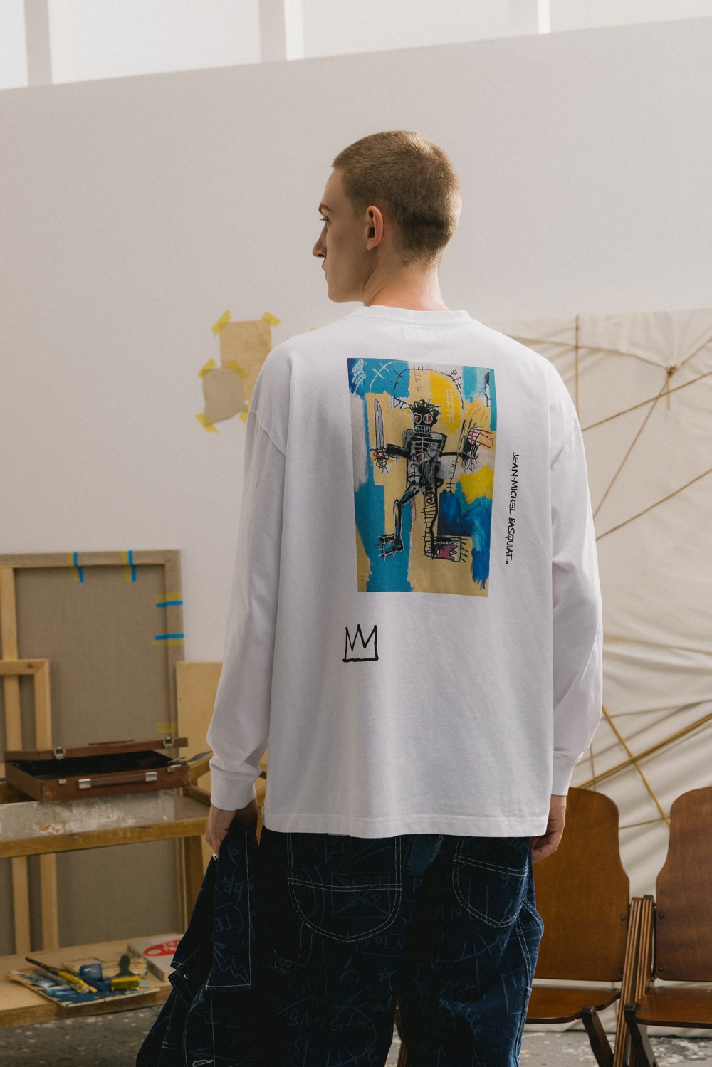 经典原色洗水 Denim on Denim 造型,细节在于以雷射印刷方法印上 JeanMichel Basquiat 的艺术作品,搭配背面印有在亚洲拍卖价最昂贵的西方艺术品 “Warrior 战士” 与其标志性经典皇冠图案的长袖 T 恤,潮流与经典并重。