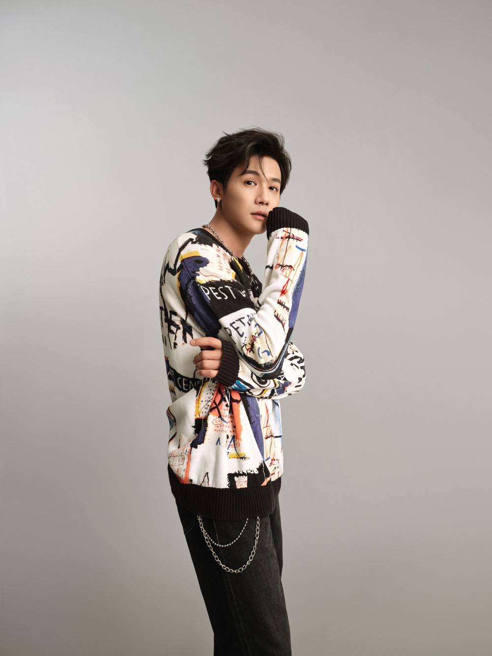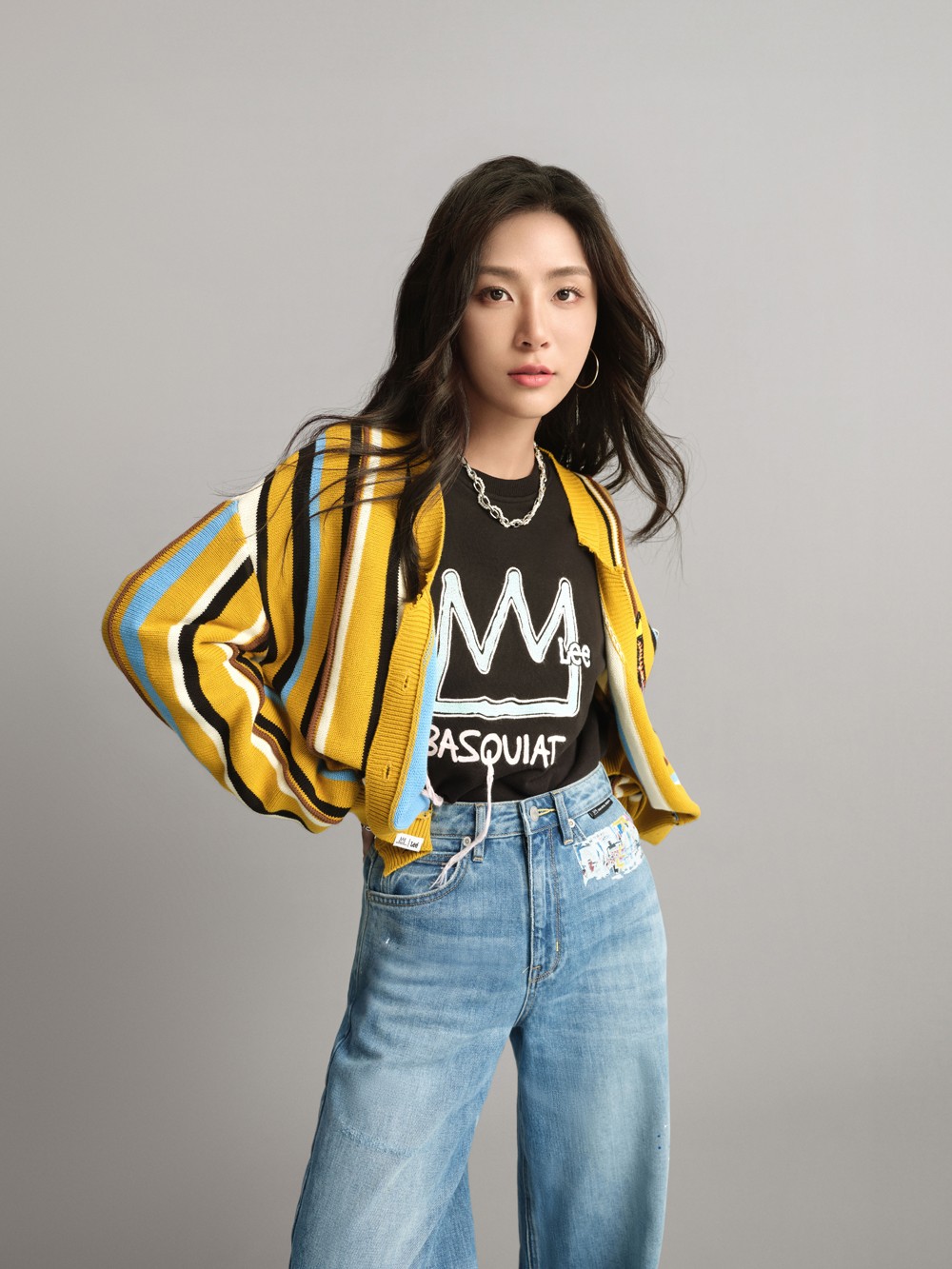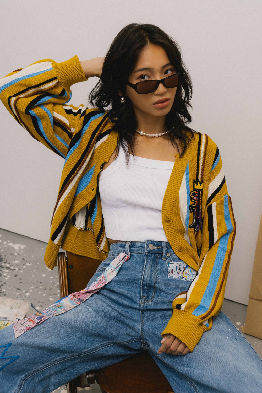 经典原色洗水 Denim on Denim 造型,细节在于以雷射印刷方法印上 JeanMichel Basquiat 的艺术作品,搭配背面印有在亚洲拍卖价最昂贵的西方艺术品 “Warrior 战士” 与其标志性经典皇冠图案的长袖 T 恤,潮流与经典并重。