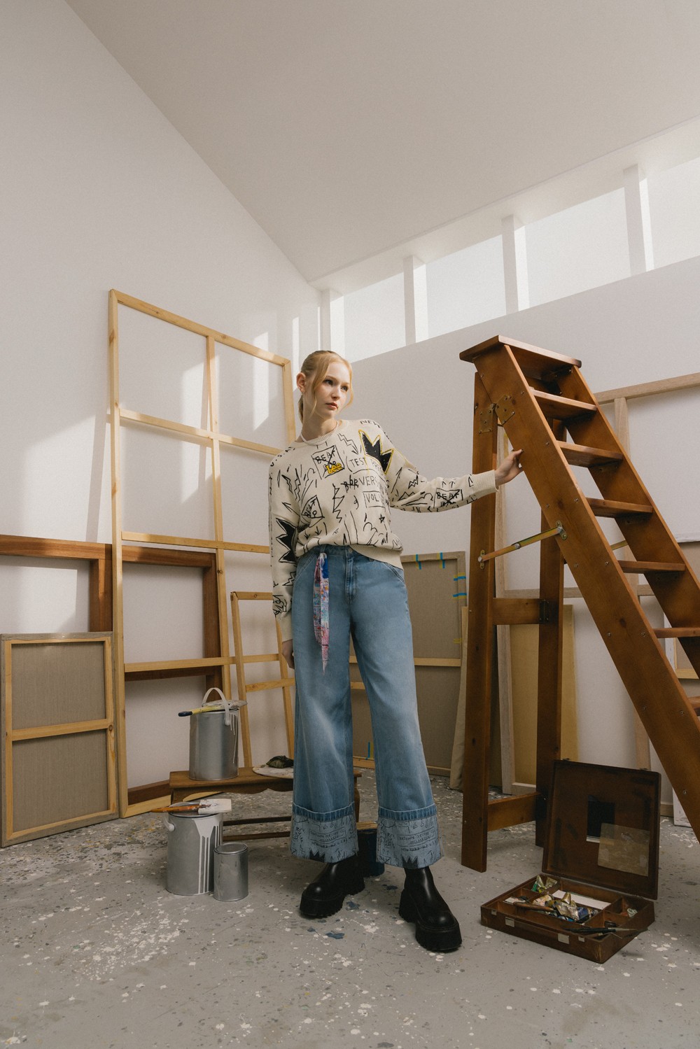 搭配的阔腿牛仔裤上的泼漆效果,则参考了艺术家在创作艺术品时的一笔一画,充分散发了创作时一股油墨飞溅的随性感觉。