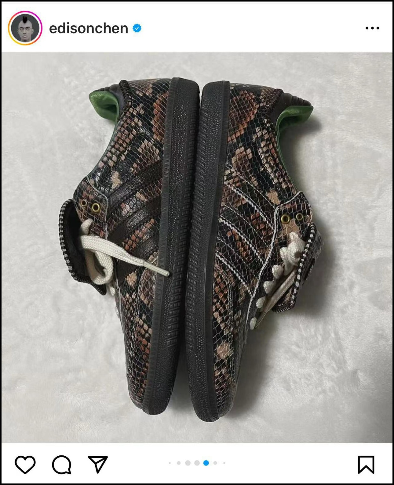 冠希晒出了一双蛇纹装扮的 Samba,只可惜是 Sample 版本的 Wales Bonner 联名款。