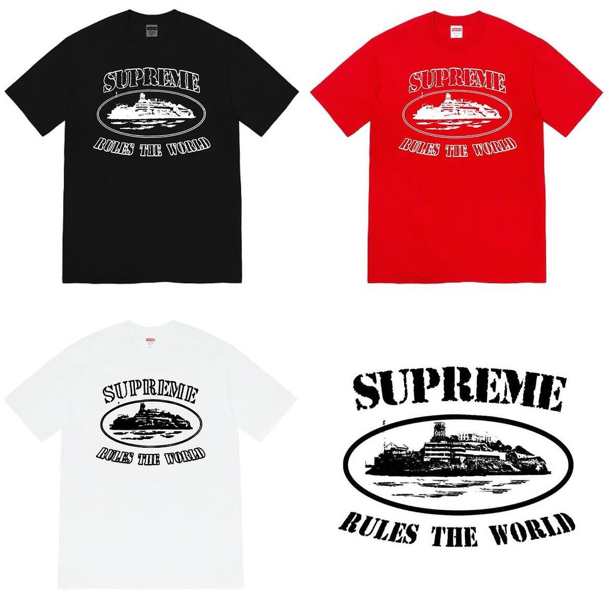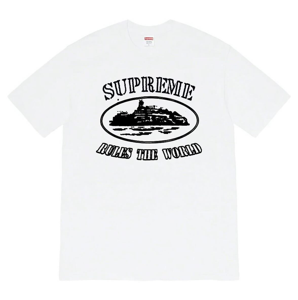 此次联名共分别推出了短袖以及连帽卫衣,并且都在胸口印有硕大的 Corteiz 和 Supreme 字样 Logo,最直接的将联名身份彰显。