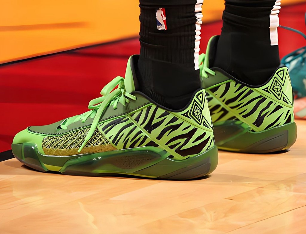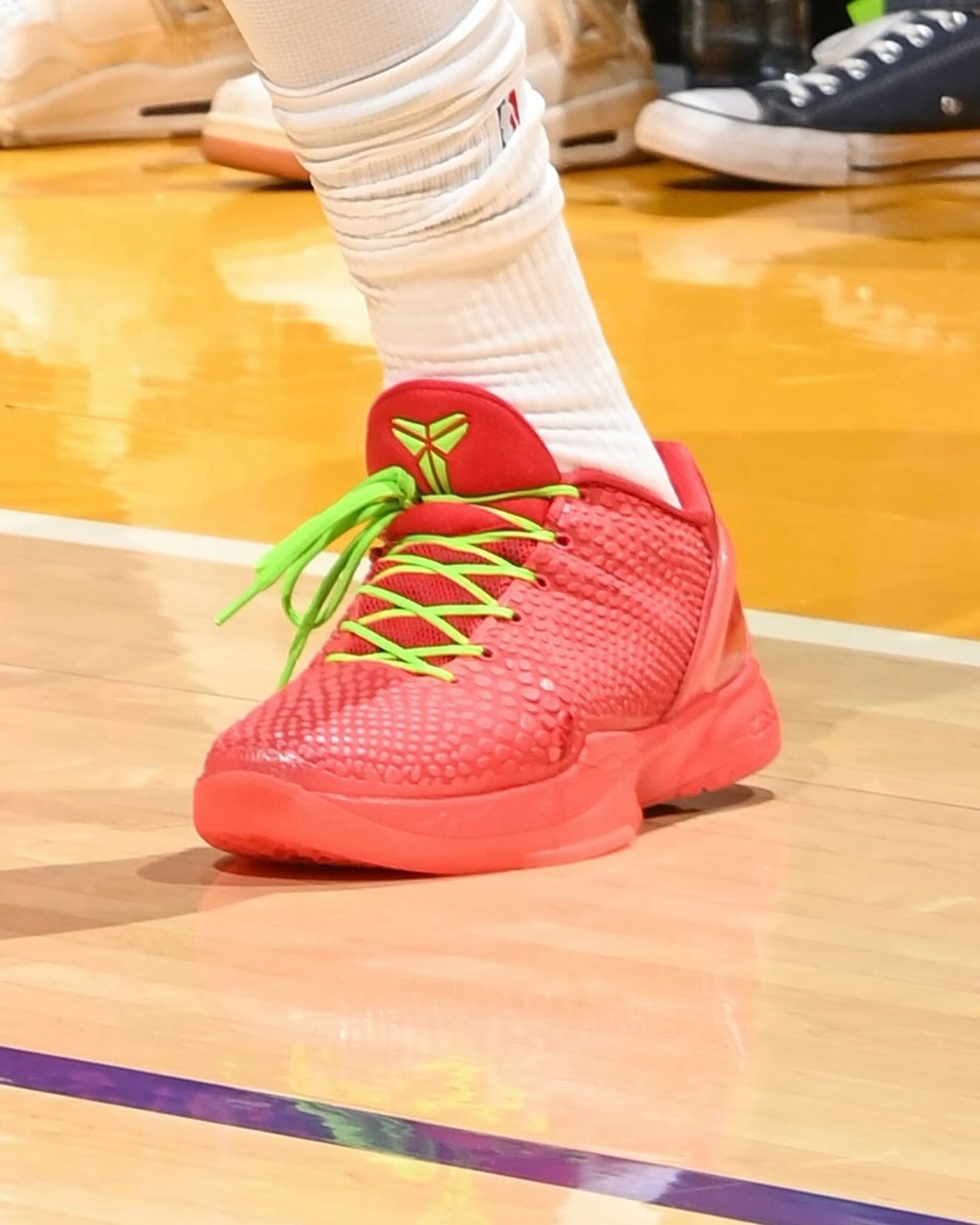 但要说最抢镜的,还得当属杰伦·布朗!脚下的「无钩版」Nike Kobe 6 Protro “Reverse Grinch” 成功让全网刷屏!抽象程度拉满。