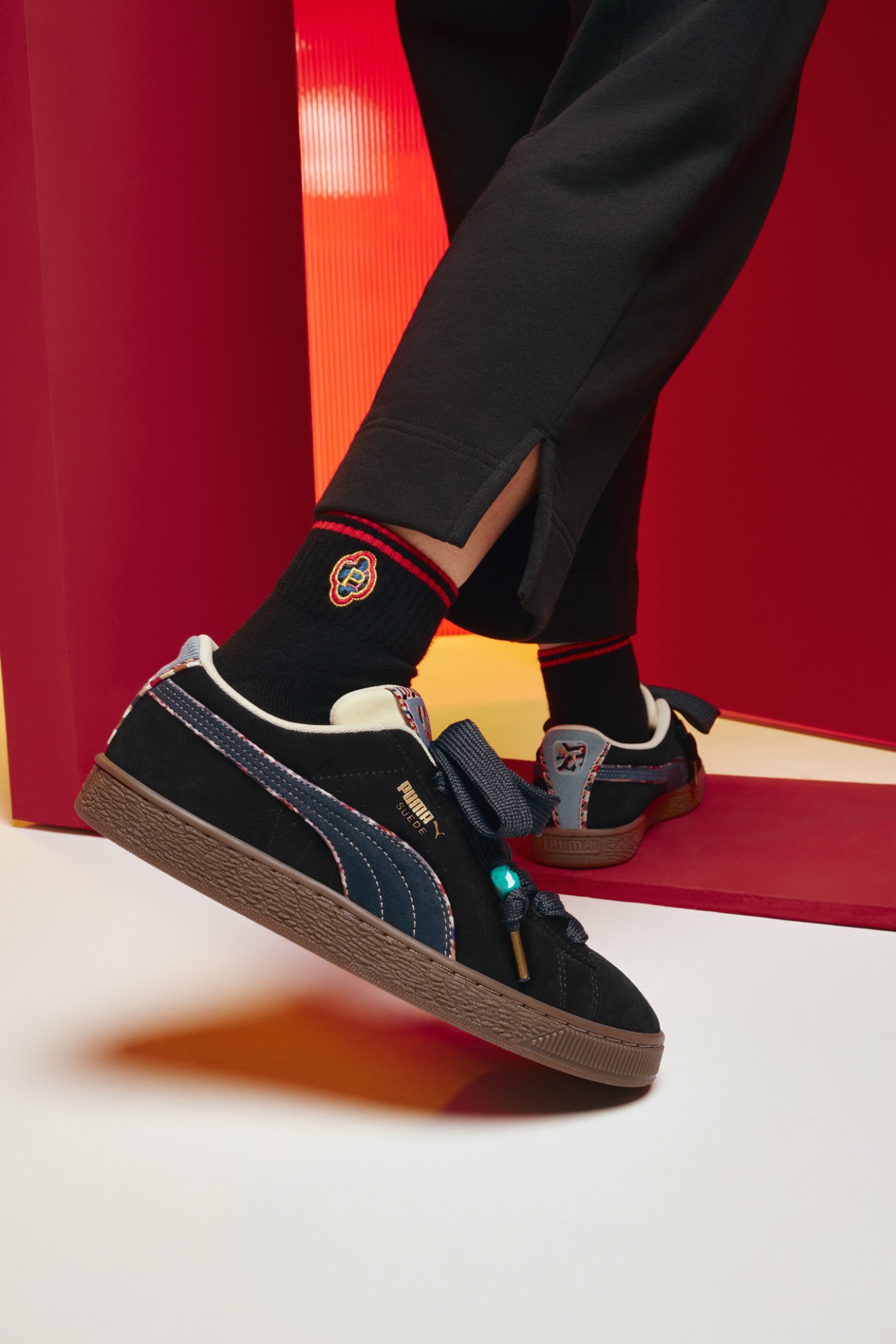 鞋款方面,Suede 占了三双,将民族国韵元素注入于鞋身、LOGO、鞋带等细节处,为运动潮流表达更添一丝中式文化韵味。