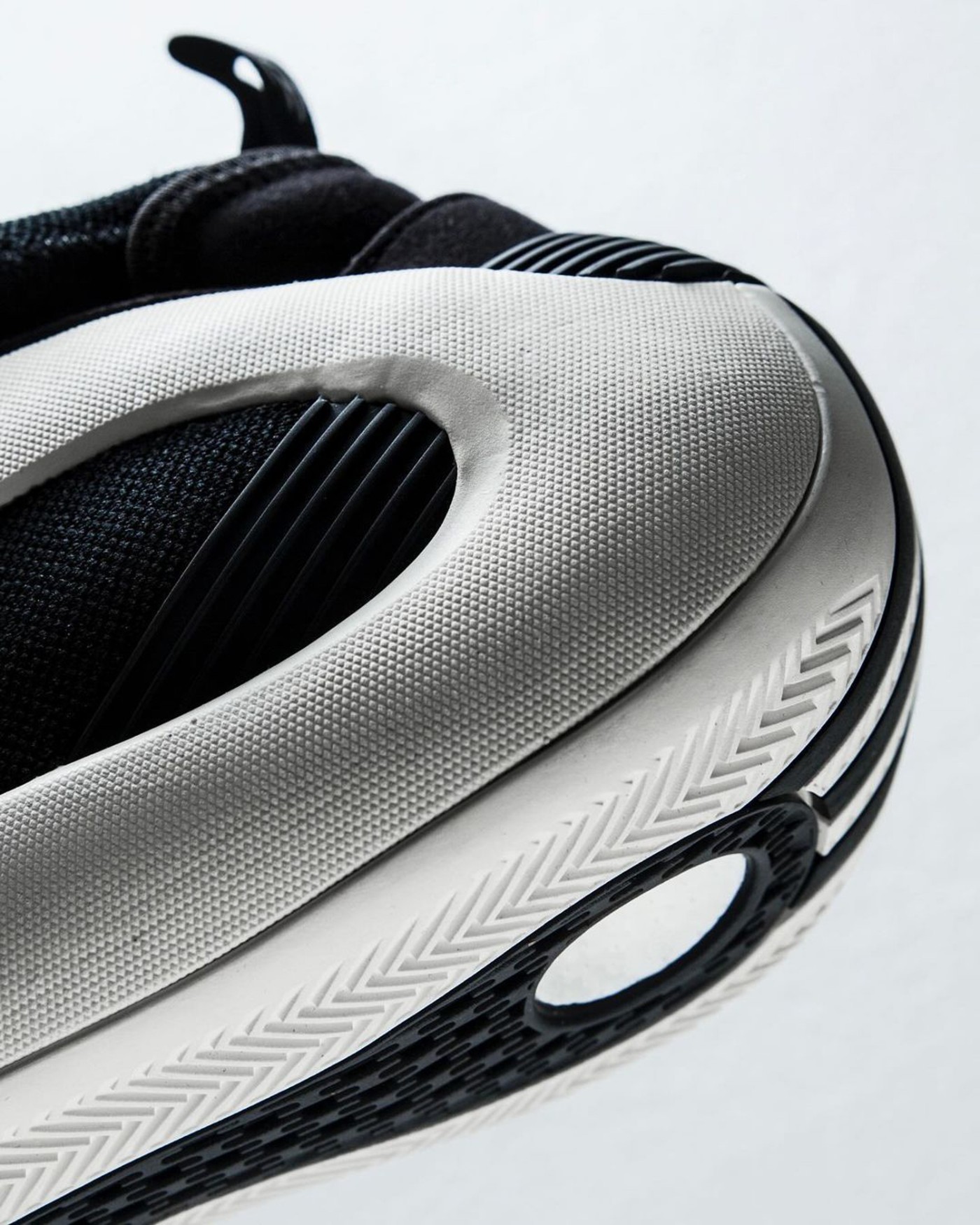 整双鞋在外形上与此前曝光版本几乎完全一致,前低后高的鞋身搭配上侧身硕大的硬质橡胶,血统这一块可谓是稳稳拿捏。