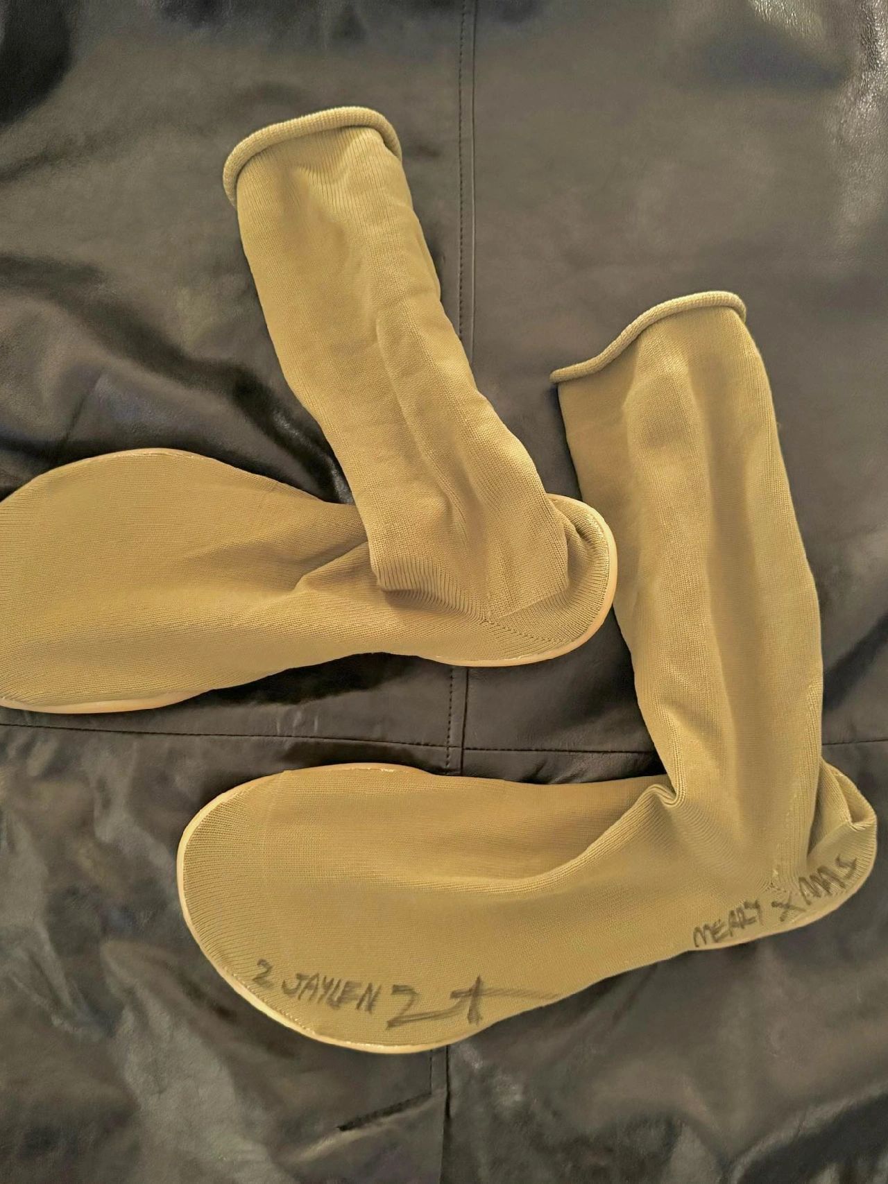这双橄榄绿色 Yeezy Pods 正是侃爷送给他的圣诞礼物,鞋上可以看到侃爷手写的祝福以及签名。