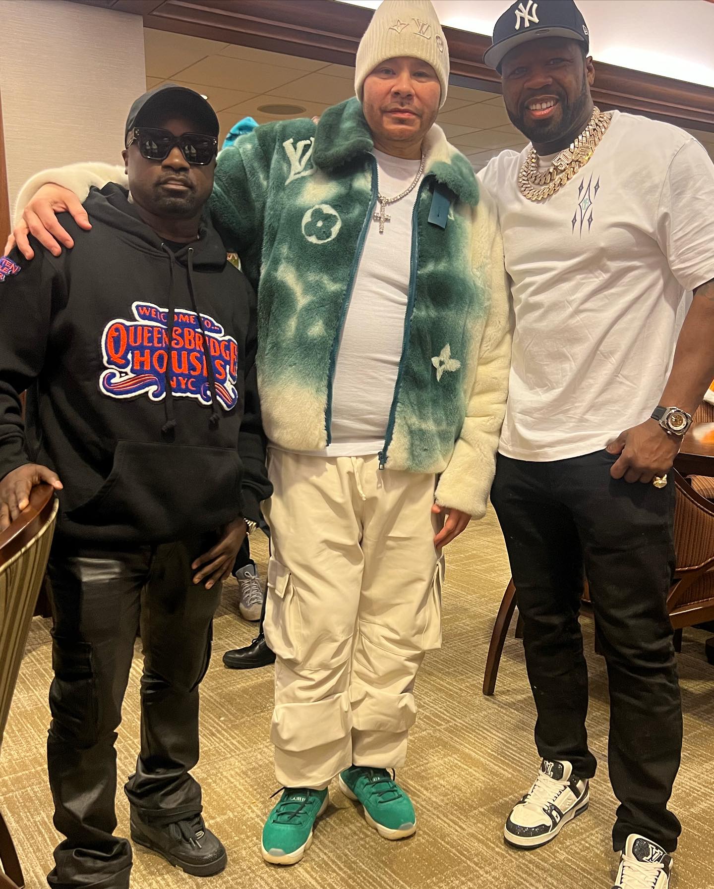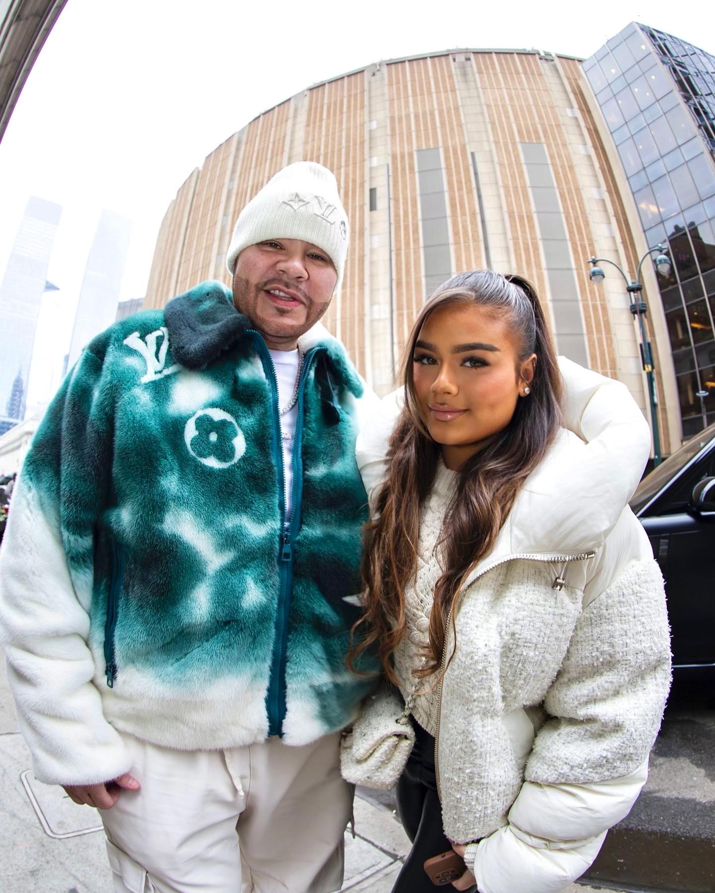 当天 Fat Joe 身着一件湖水绿色的绒毛 Louis Vuitton 外套和一条多口袋米色工装裤,造型街头感满满,即使不唱歌也能明确知道时隔 Rapper。