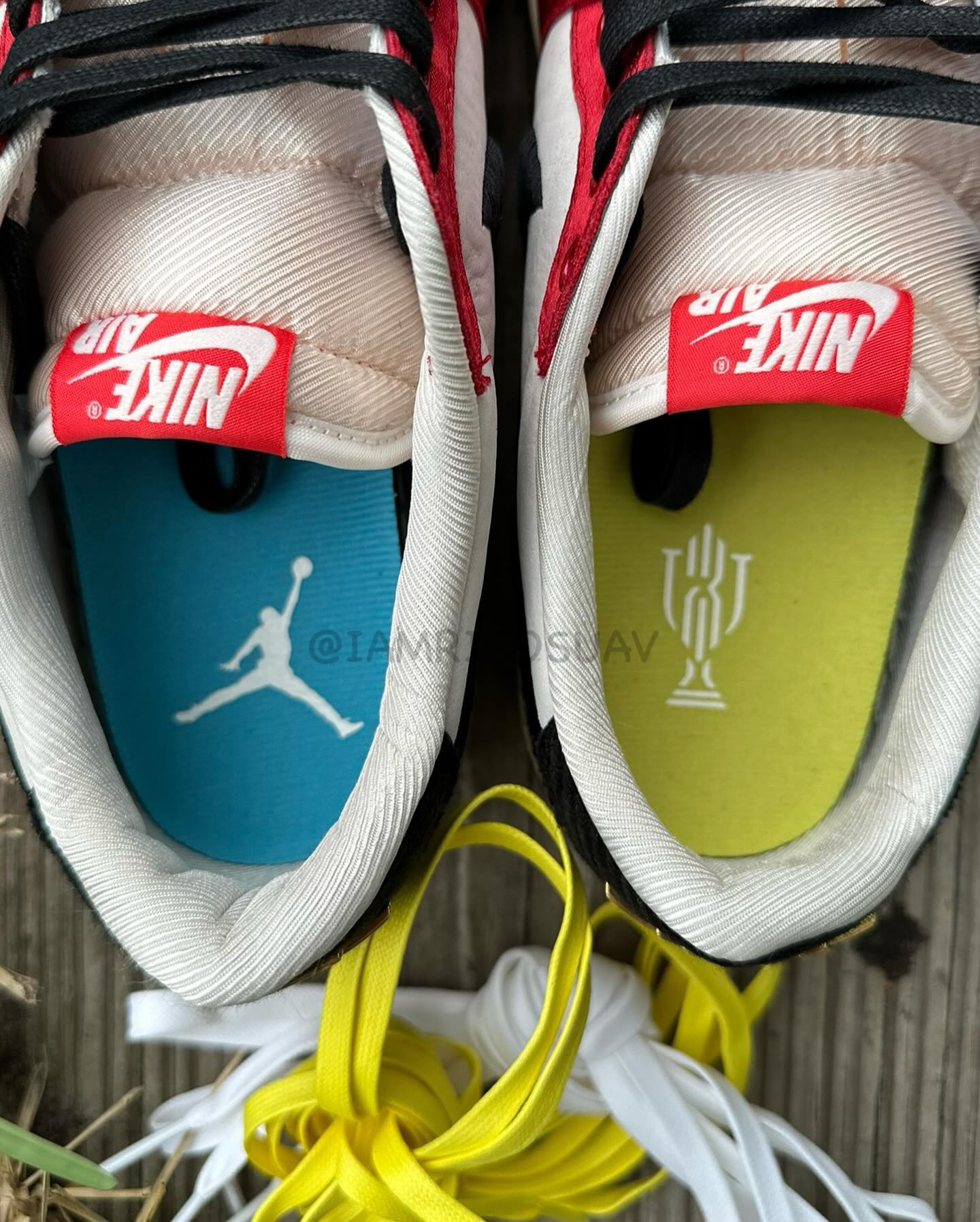 鞋垫处采用黄色和蓝色搭配,并分别印有飞人和 Trophy Room Logo。