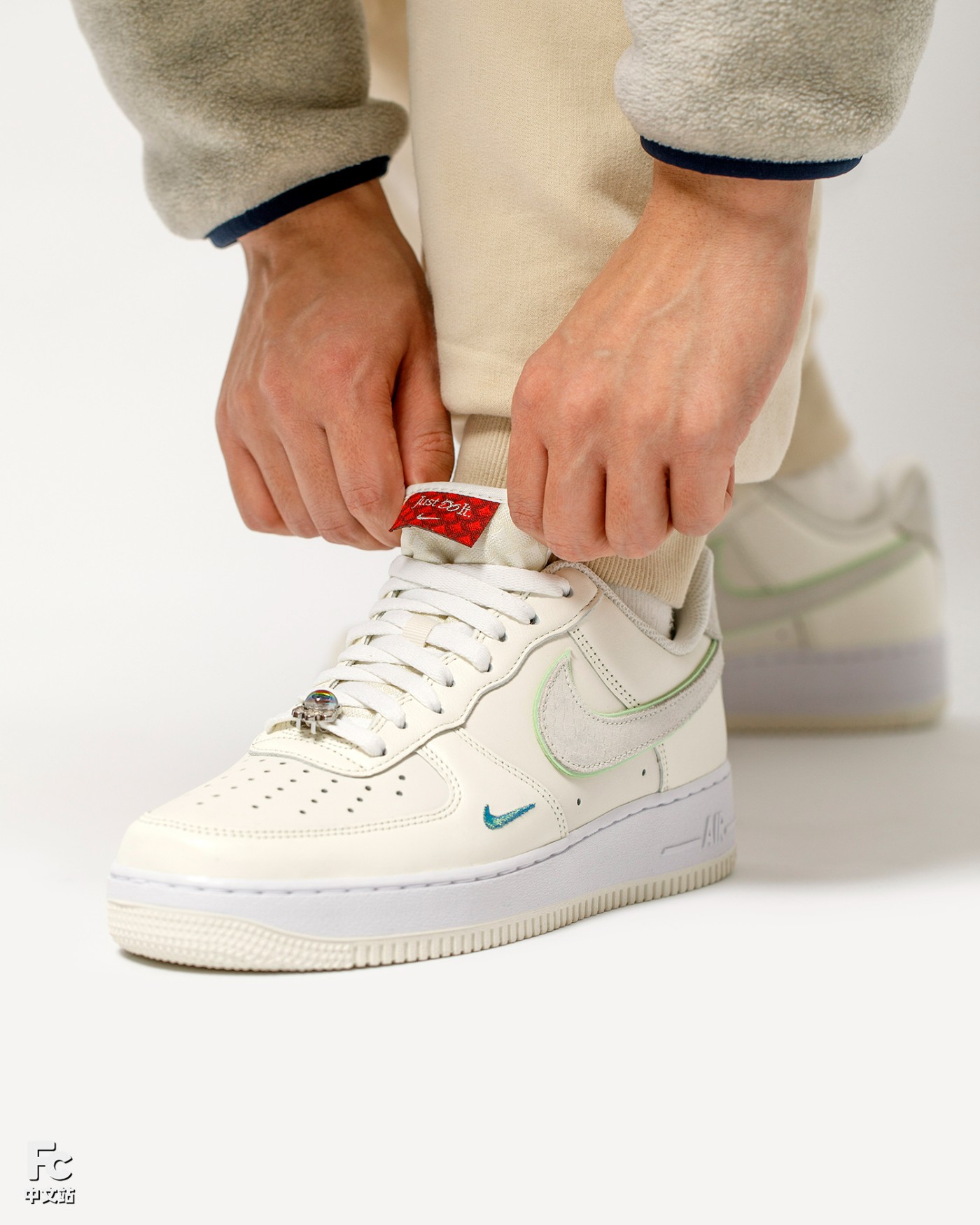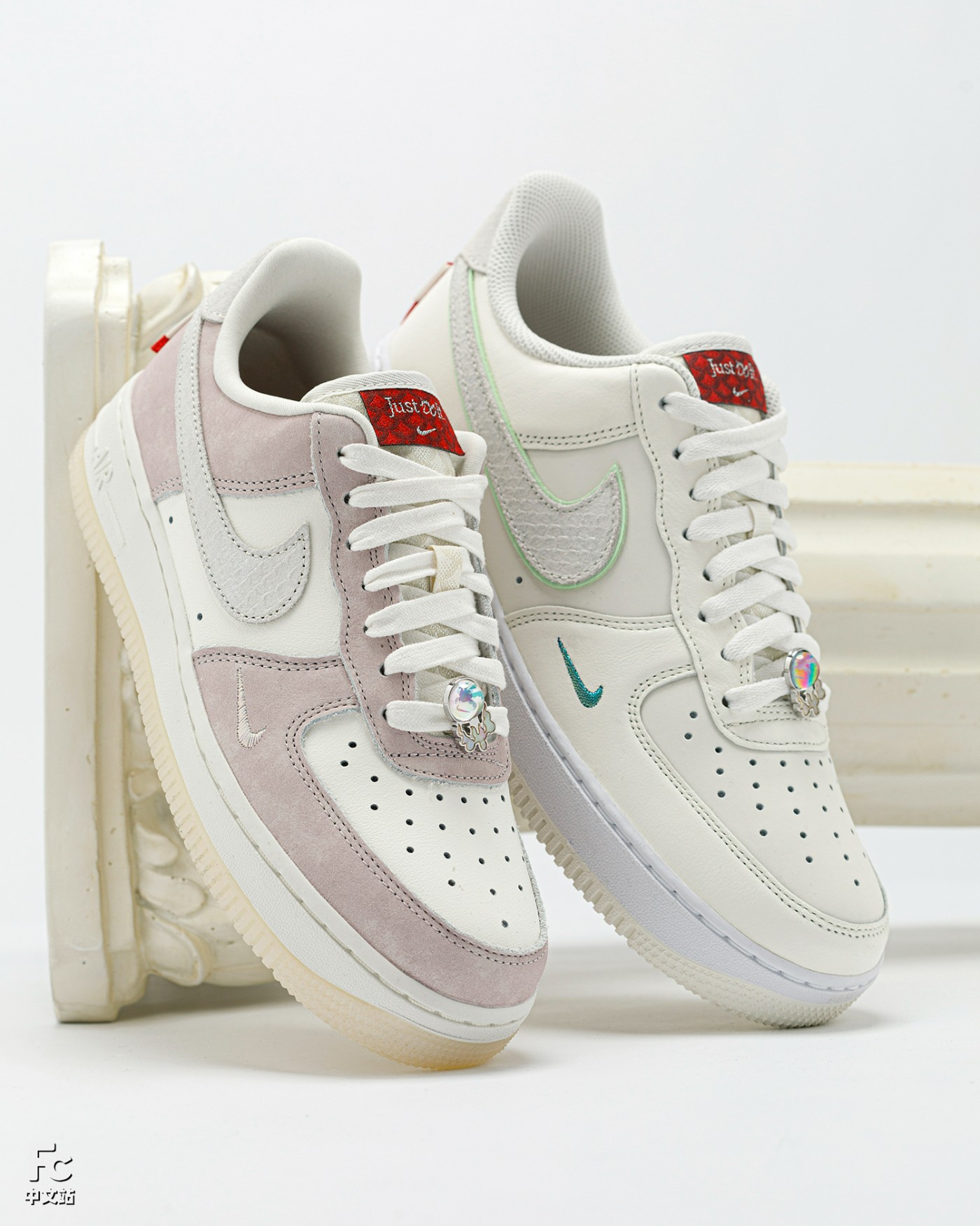 这两双 Air Force 1 配色上没有采用年味十足的中国红装扮,使用浅色为主调,优点是摆脱了只能过年穿的时间限制。