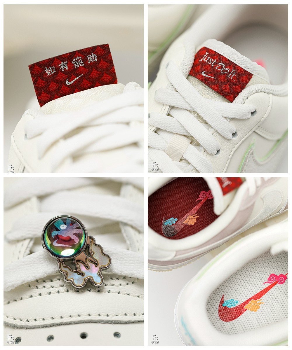 近看细节刻画可圈可点,比如鞋舌标签以龙鳞纹路装饰,并且 Just Do It 其中的字母 D 改为龙形态的呈现,是小编认为最好看的细节。