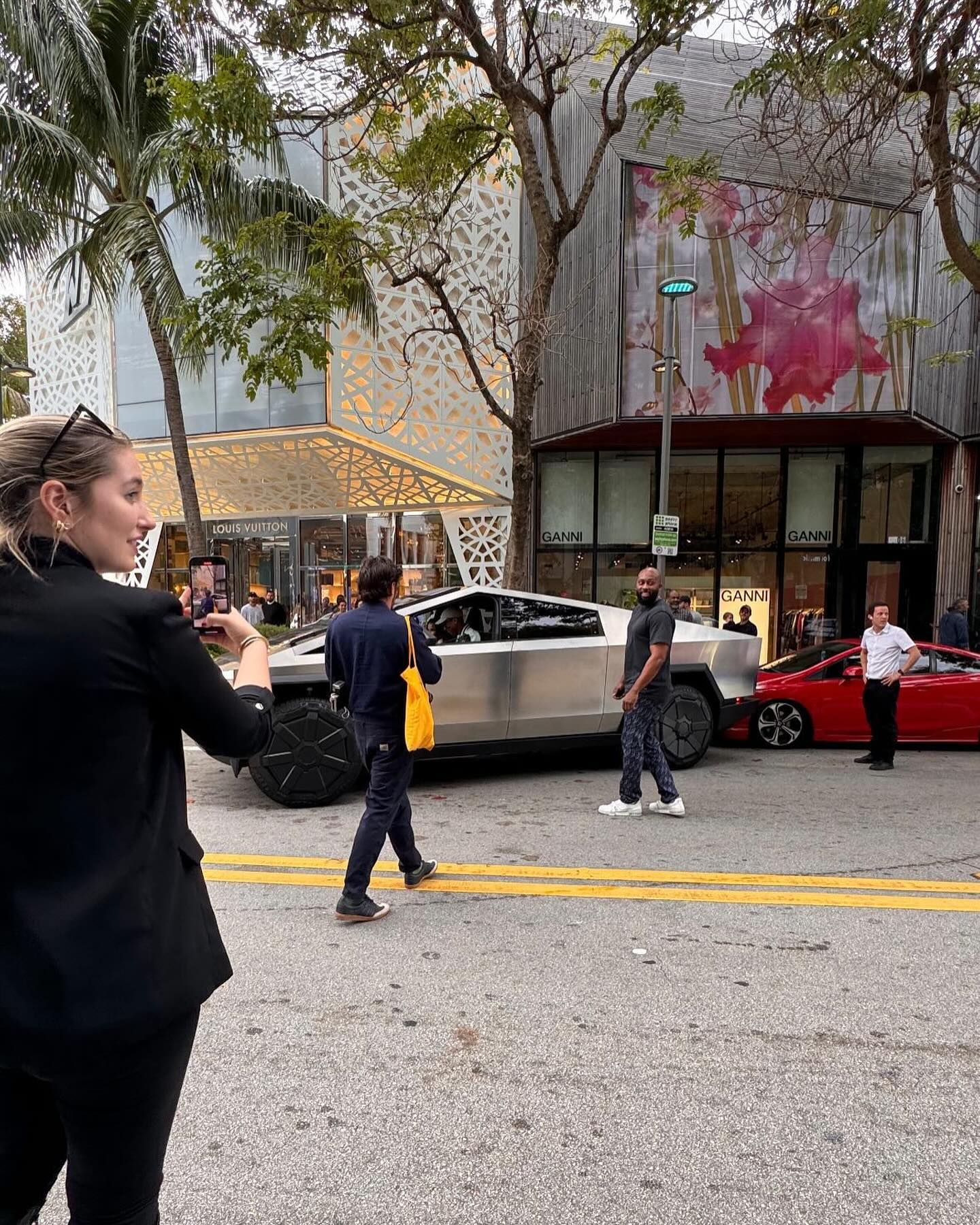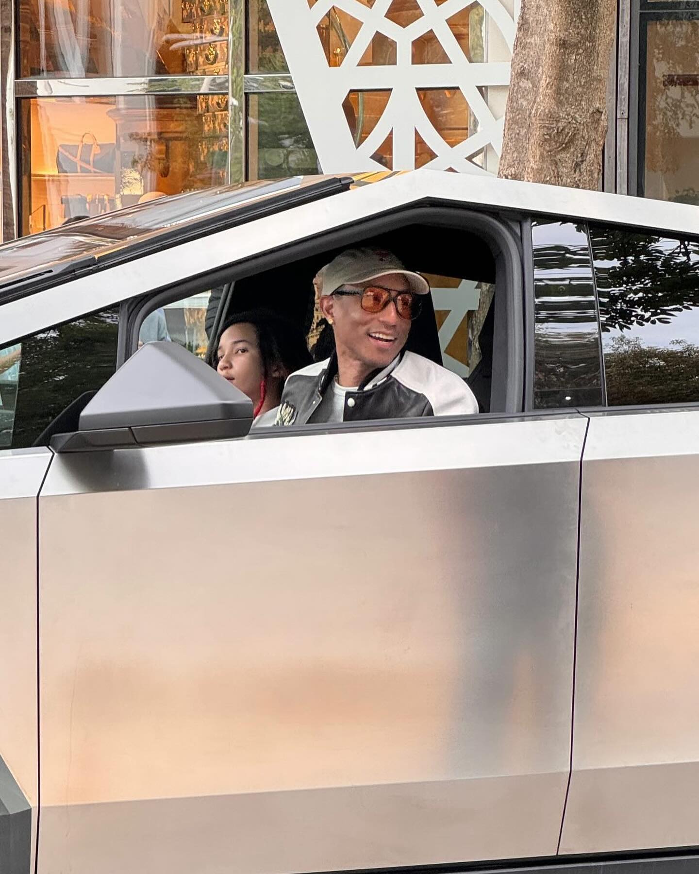 Pharrell Williams 菲董在迈阿密的街头被拍到驾驶着一辆特斯拉 Cybertruck。 这款有着浓厚未来科技感的特斯拉新车,目前是全球关注的焦点之一,不仅有着极富辨识度的硬朗轮廓,不锈钢材质的车身,也带来独特的质感。 由于量产的难度很高,目前仅仅交付了 10 辆。 马斯克表示,目标是每年生产 25W 辆,但至少要到 2025 年才能实现。 菲董当天依然穿了中国成都之行的那件外套,一款全皮打造的横须贺夹克,可见他对于这件衣服的格外青睐。