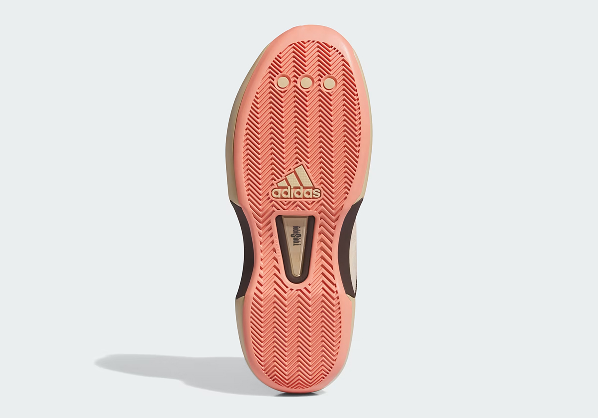最后棕色中底搭配足弓处带有 TPU 的粉色外底收尾,完善整双鞋设计。