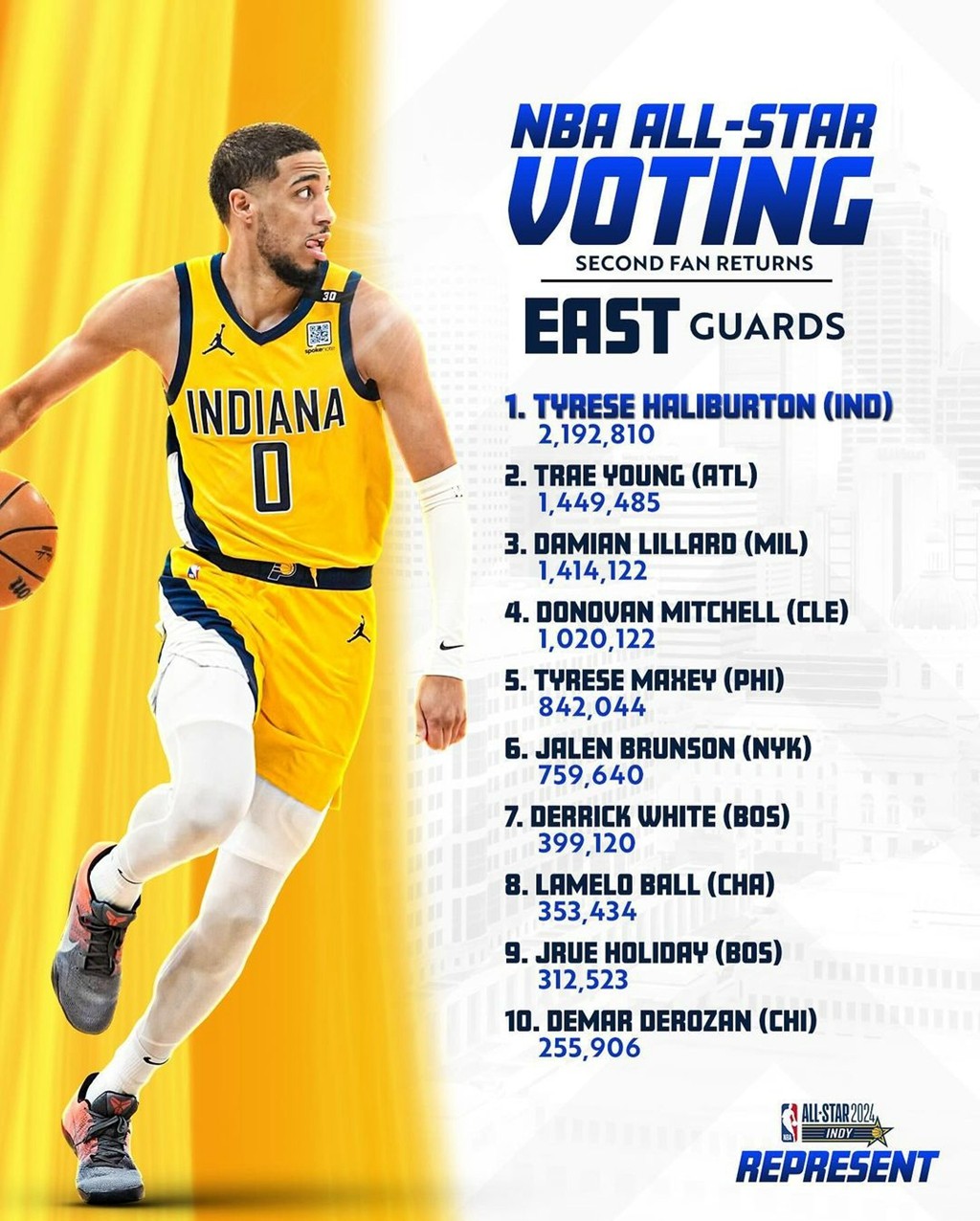 东部后场方面,哈里伯顿本身实力出众,又是今年全明星的东道主,因此票数高居第一。