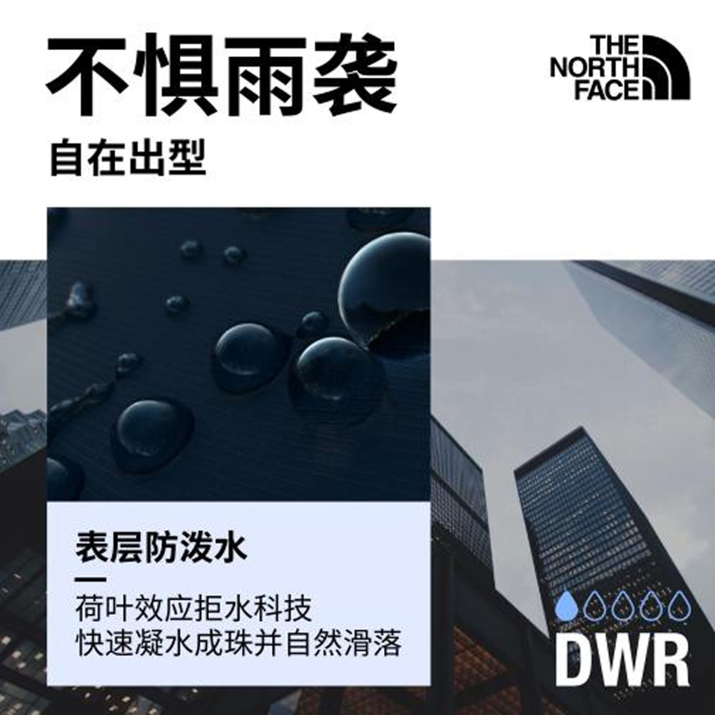 面料上还采用了防撕裂面料、DWR 科技,从外面直接将水分阻隔,实现真正的防泼水效果。